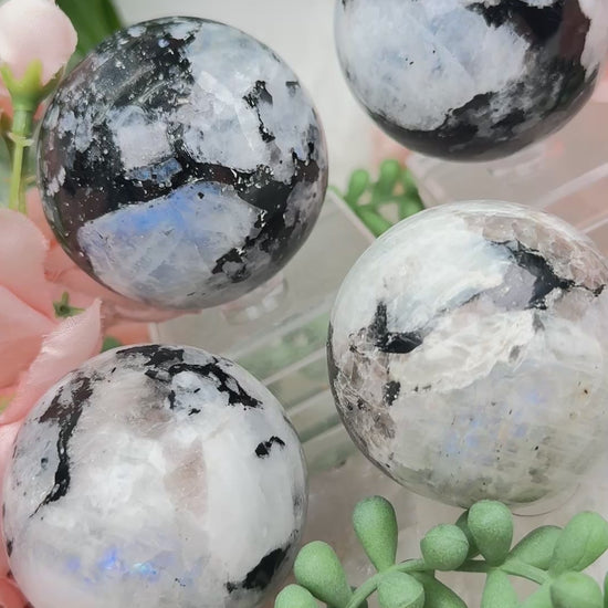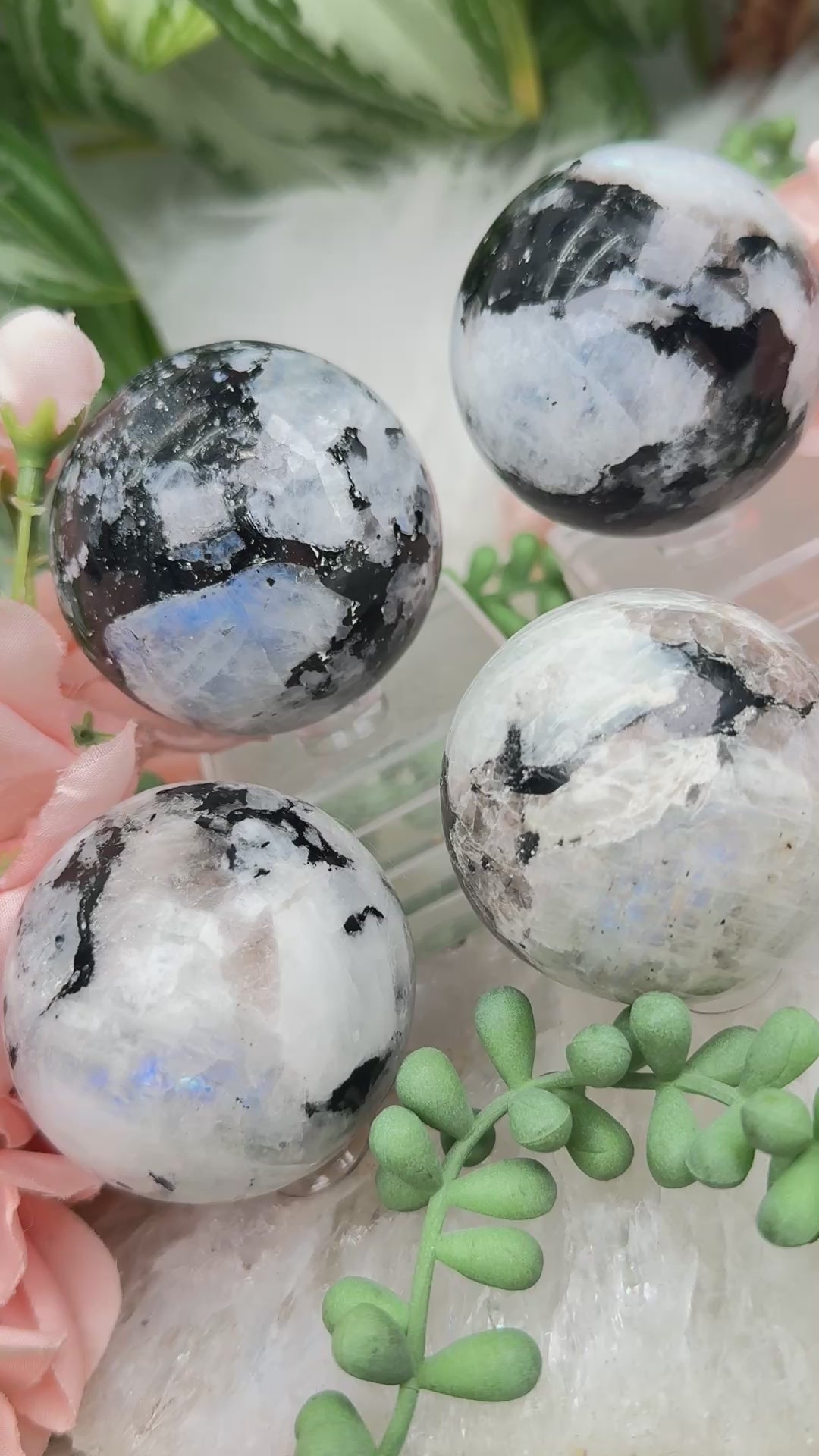 Super cute moonstone spheres from India! All of these have at least one flash spots, with some having more little spots in addition. Most have blue flashes, but some have some rainbow colored flashes. Check out the video to really see these all in action.