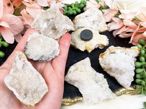 Cute sparkly little Morocco Quartz magnets for your crystal decor needs! Each one features a white quartz and light tan matrix stone. Shape and size of each quartz geode piece will vary.  The magnets are actually pretty strong too!