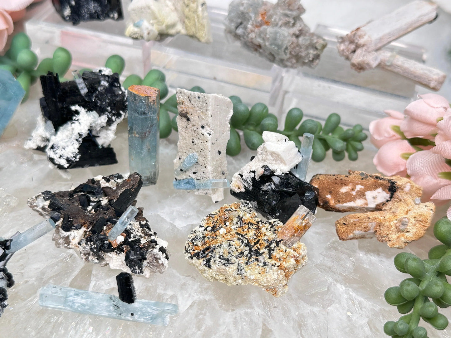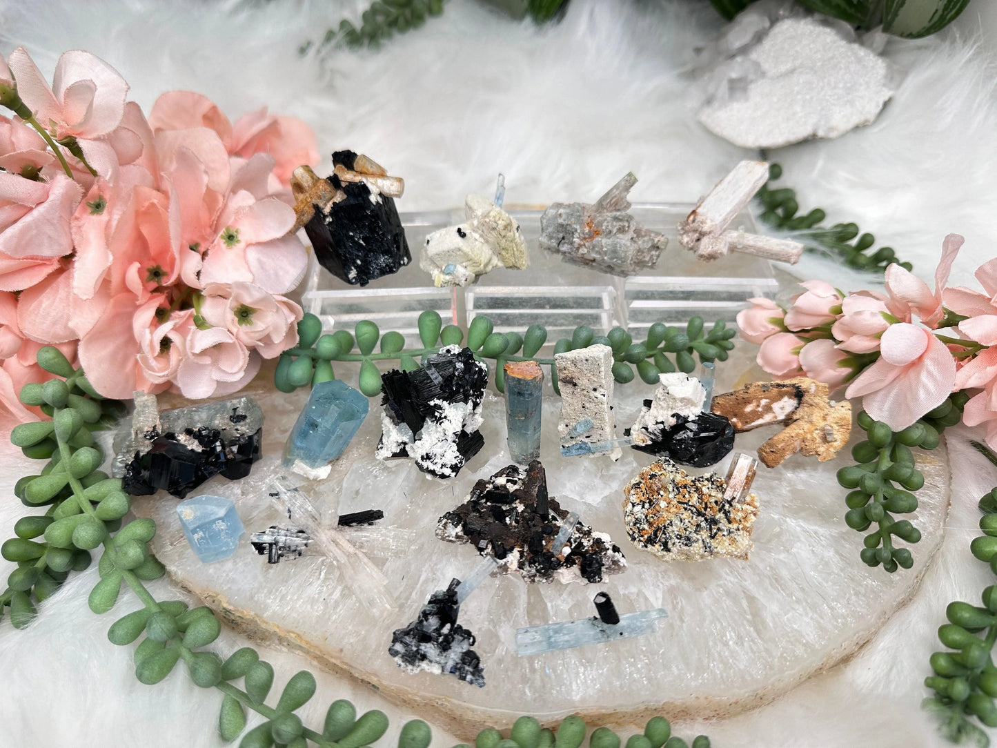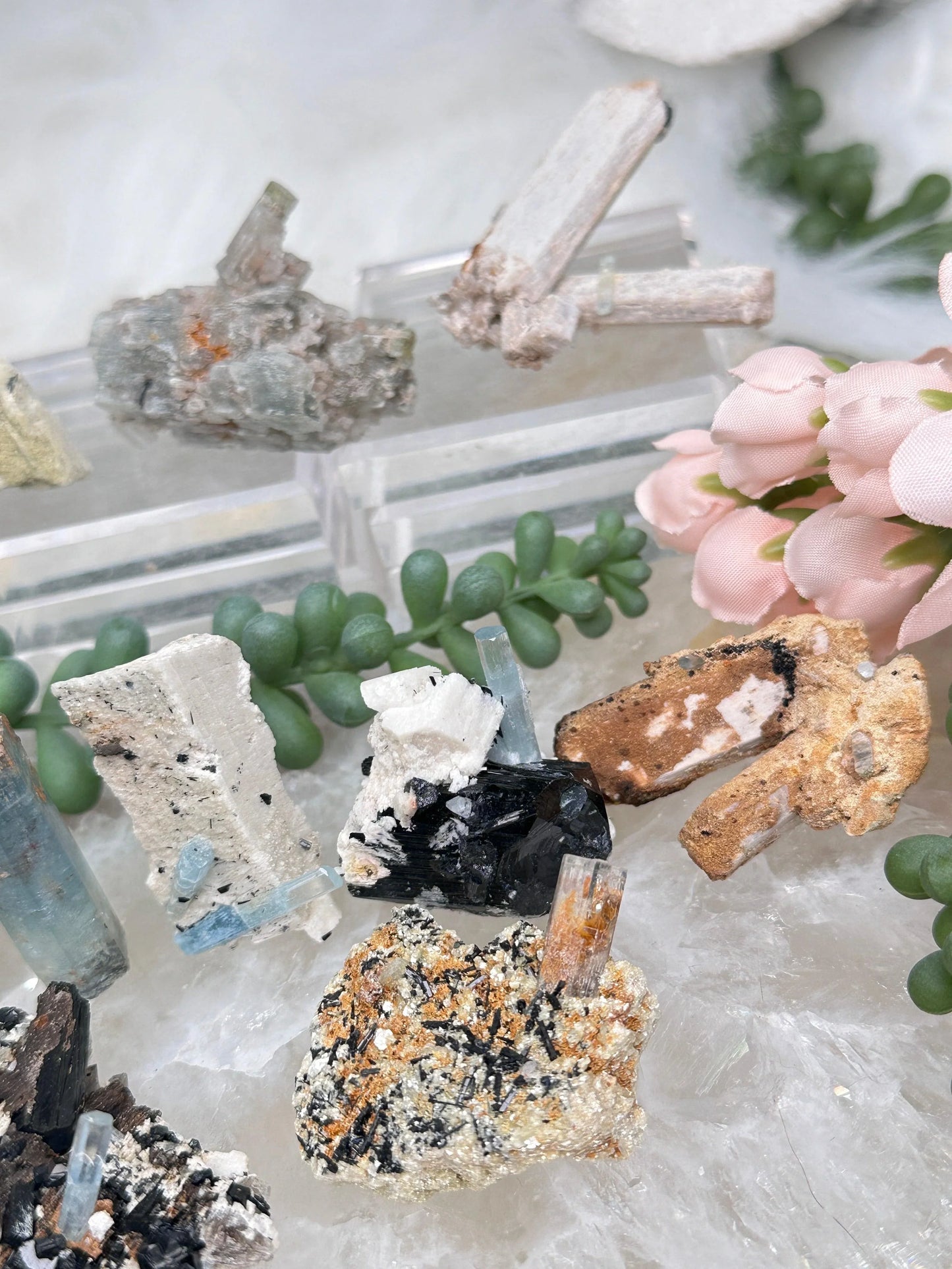 Tiny little mostly blue aquamarine and other beryl specimens from Namibia! These are going to be many colors of beryl including blue (aquamarine), clear (goshenite), and green (but really just a greenish blue hue), but most are aquamarine. Some are mixed with black schorl tourmaline, some white microline, and a couple with mica. Some are just beryl on their own. Take a look at the video to see the details on these small pieces. You could even grab an acrylic square to mount these on!