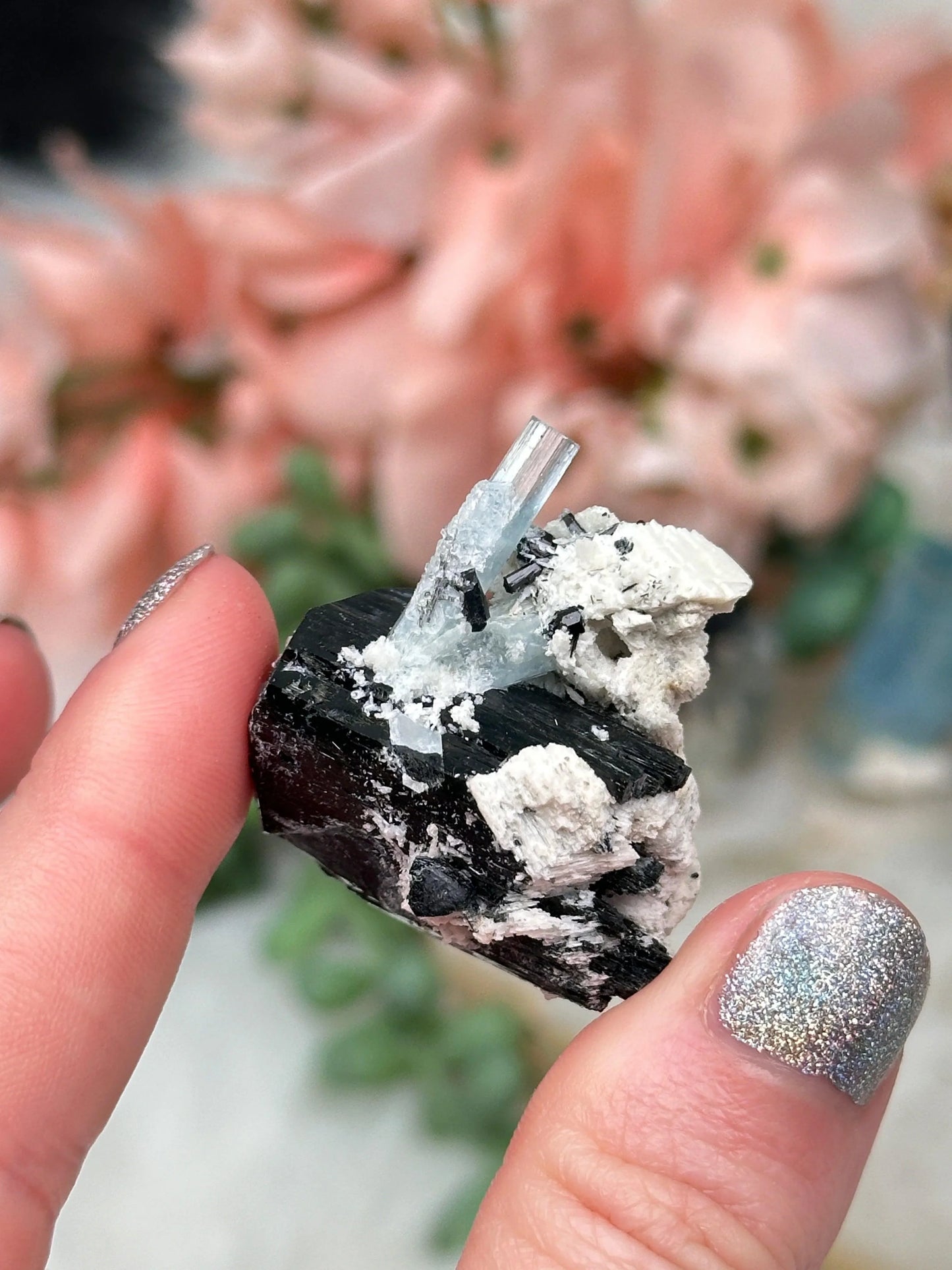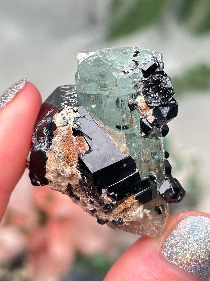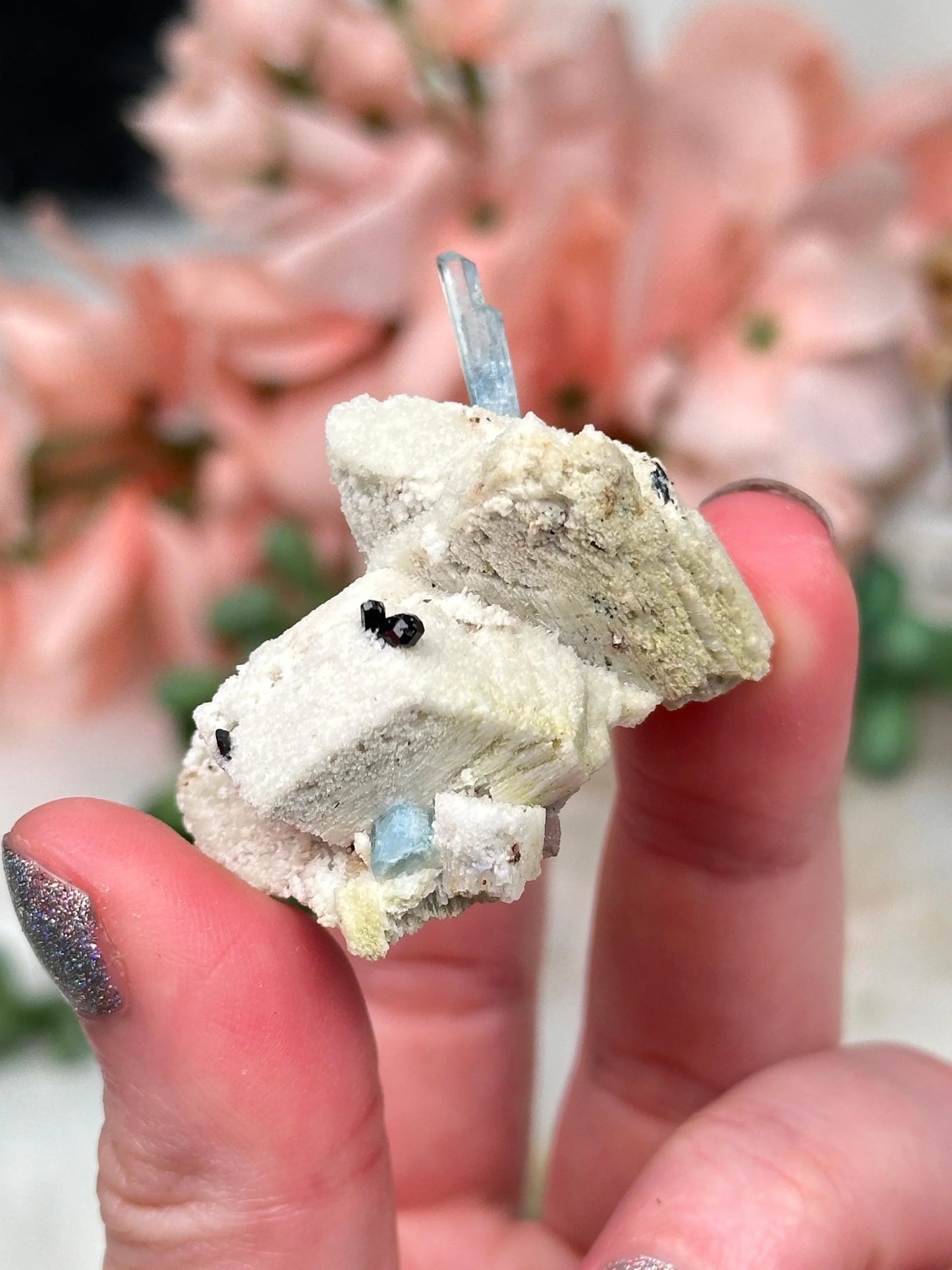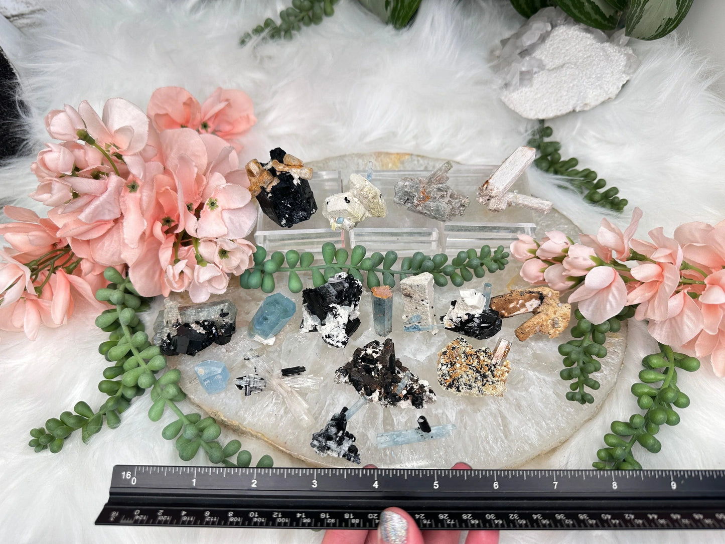 Tiny little mostly blue aquamarine and other beryl specimens from Namibia! These are going to be many colors of beryl including blue (aquamarine), clear (goshenite), and green (but really just a greenish blue hue), but most are aquamarine. Some are mixed with black schorl tourmaline, some white microline, and a couple with mica. Some are just beryl on their own. Take a look at the video to see the details on these small pieces. You could even grab an acrylic square to mount these on!