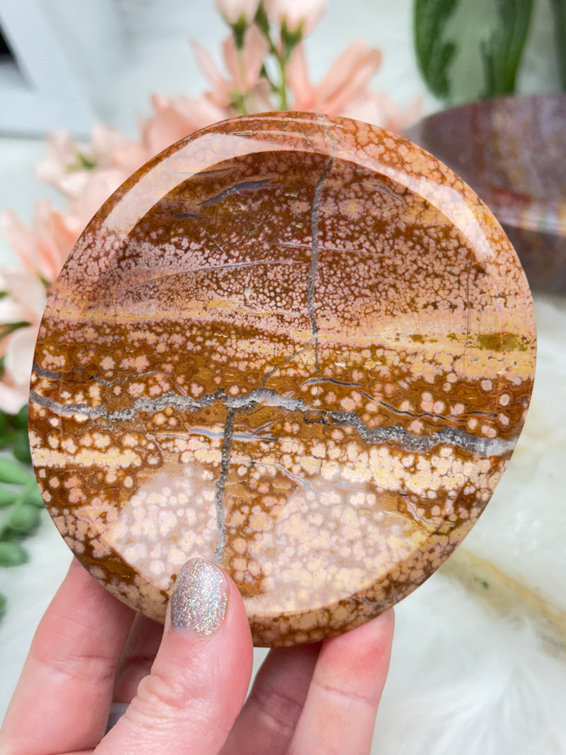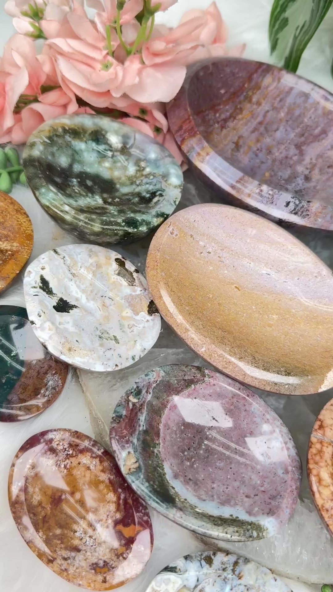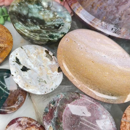 Beautiful one of a kind Ocean Jasper crystal bowls in a variety of colors, shapes and sizes.  These jasper bowls make great jewelry dishes, or a little bowl to hold your keys by the front door. Or the smaller ones are perfect for rings and earrings next to a sink or nightstand. All are from Madagascar! Please note that they do wobble a little bit, but will not tip over.
