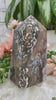 Ocean jasper obelisk point from Madagascar with a mix of colors including tan, green, white, and a very subtle blue. Very slight orbicular pattern to it. This obelisk point does wobble a bit, and sits a little wonky on some sides. But I still think it is adorable!