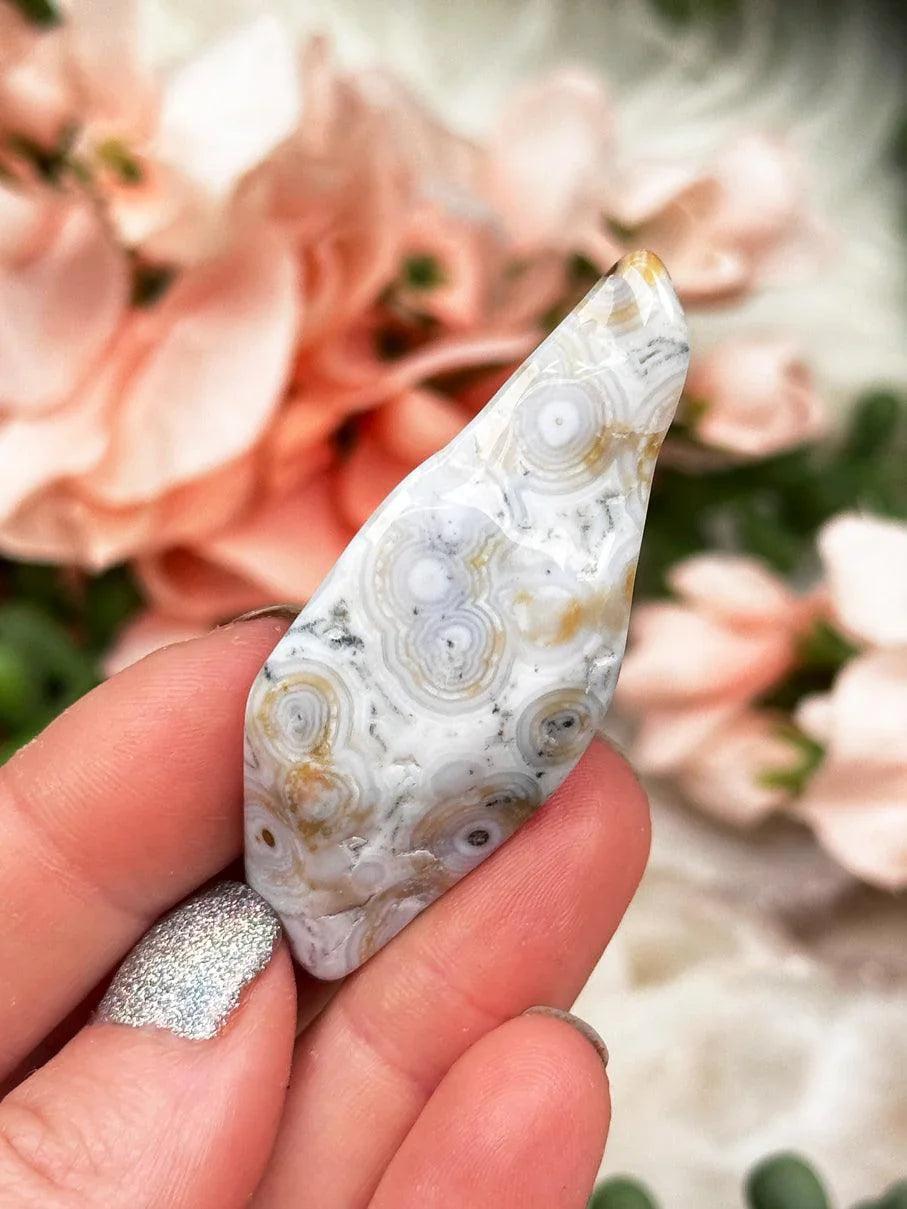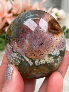 Stunning Ocean Jasper Palm Stones in a wide variety of colors, patterns and sizes. Choose your exact piece! Â These ocean jasper stones are from Madagascar and have tons of patterns like orbicular (more of a dot), linear, and everything in between. The colors of these range from teal, white, green, tan, white and so much more! You can also see these on the video for a better look at each one.