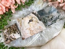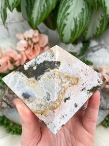 Cute little ocean jasper pyramid crystals from Madagascar. These ocean jasper crystals are all different colors. The smallest on left is a mostly green coloring with hints of white and pink mixed in. The largest center one is actually a bit of a baby pinkish orange color with some green, brown and whites mixed in. And the right one is an overall grayish blue color with greens, grays and blues. The one on right is also the most orbicular pattern.