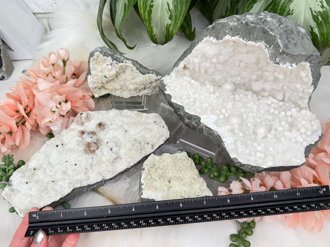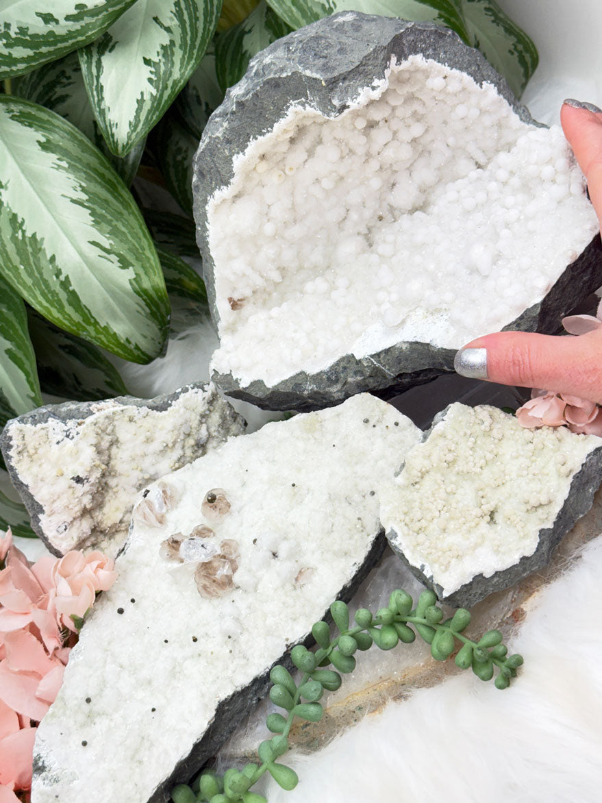 Stunning is an understatement, and photos and video aren't even doing these pieces justice. Featuring a very large white okenite, gyrolite, and chalcedony 'clam' looking geode piece. Then there is one large white chalcedony and gyrolite mix that has some tan-brown calcite on the face. Then the other pieces are a tan-green colored mix of gyrolite and chalcedony, a few of those have fluffy white okenite. PS, the 'furry' ones are the okenite. : ) Take a look at the video for all of the little details, and also to see how they sit or lay. A couple of these even have a little UV reaction!