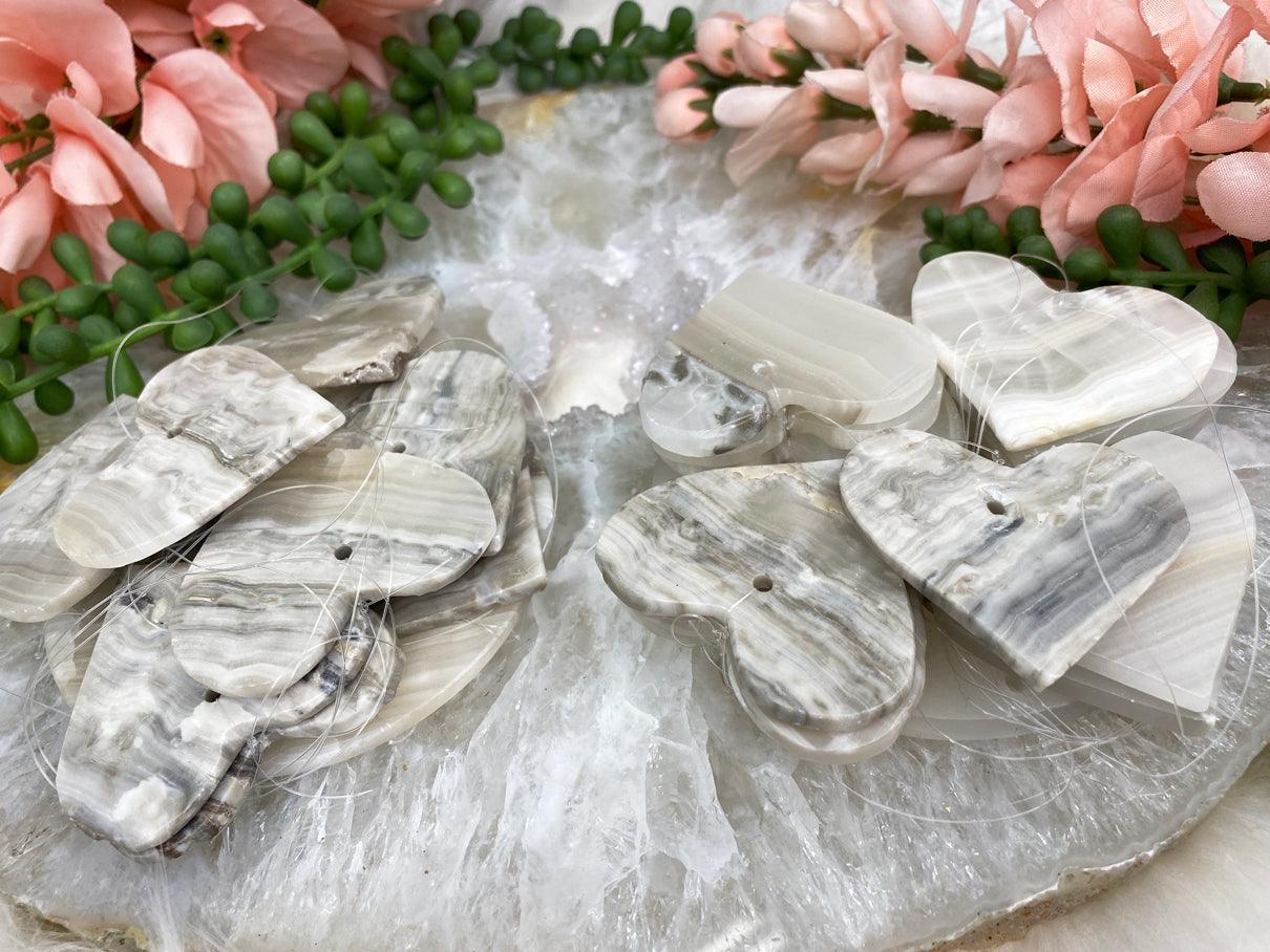 Simple but unique banded gray onyx wind chimes with a beautiful sound. The top has a round piece and the 'dangles' are hearts. The pieces on these chimes are full of lines and marbling to give it a one of a kind feel. The color on this will be an overall gray coloring due to the markings and lines on these. The most distinctive part of the Onyx Heart Wind Chime is the parallel lines that run through it. This chime is sure to add beauty and serenity to any space.