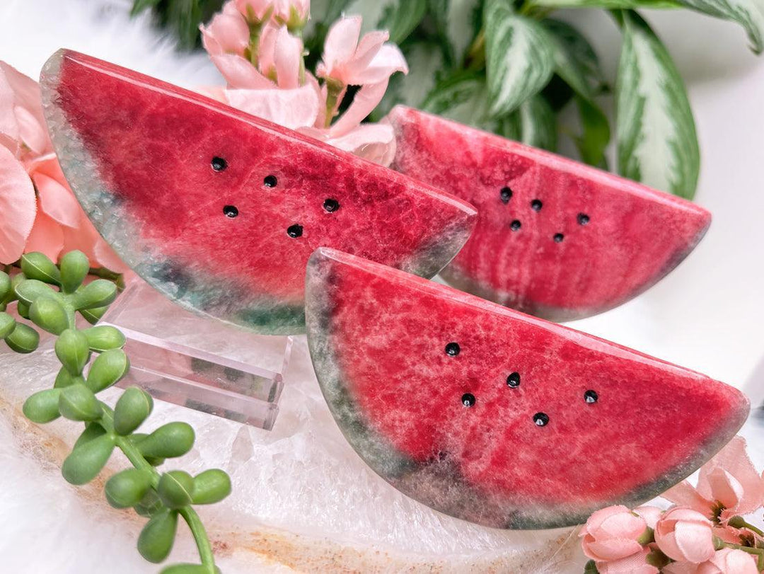 Beyond their playful appearance, these Watermelon Slice onyx crystals carry the inherent energy of onyx. Onyx is traditionally associated with strength, protection, and grounding, making it a meaningful addition to your crystal collection. So, while they bring a smile to your face with their whimsical design, they also serve as powerful talismans, combining both aesthetics and metaphysical significance in a truly unique and fun package.
