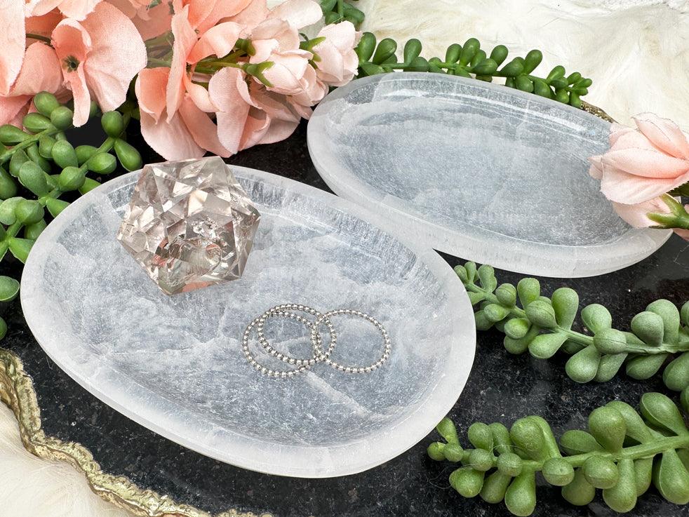 Beyond its cleansing attributes, Selenite is a powerhouse crystal revered for its ability to infuse light and serenity into one's life. It acts as a key to unlocking the higher chakras, particularly the crown and third eye chakras, facilitating spiritual insight and connection. Selenite's tranquil energy not only purifies your crystals but also provides a sense of tranquility and clarity to your surroundings, making these oval Selenite plates a harmonious blend of beauty and functionality.