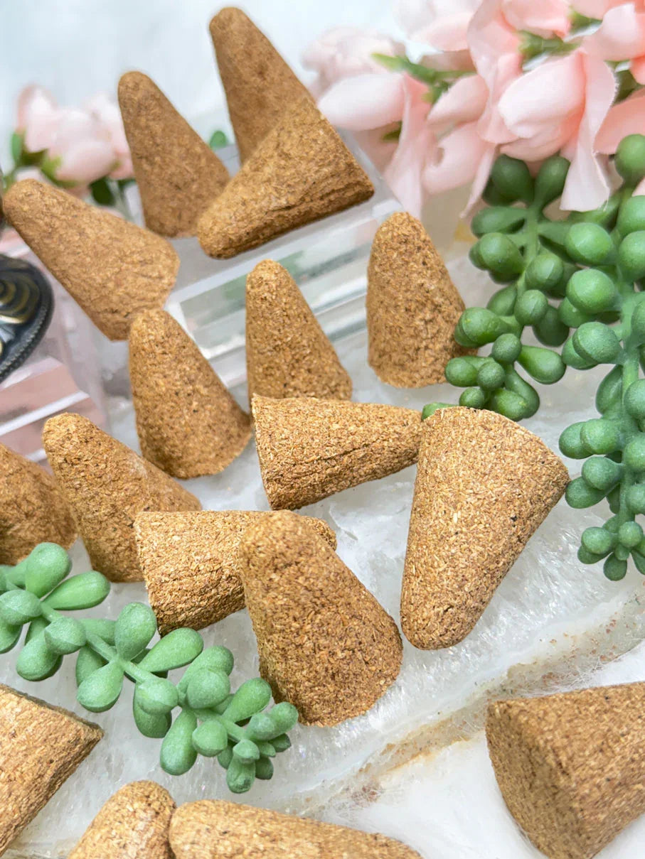 Palo Santo Incense Cones. Palo Santo smoke is used to help cleanse the energy of one's home or crystals. For me, it reminds me of cozy fireplaces or campfire memories and immediately brings me happiness. Unlike traditional Palo Santo Wood sticks, these incense cones will burn continuously once you light (and blow out).  They burn for approximately 30 minutes each.