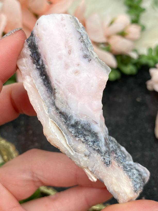Beautiful and calming pastel Pink Opal pieces from Peru. These pink opal crystals have some light pink and/or white, and black veining and marks. Perfect pastel coloring for your space. Most of these are small raw chunks, but one is a polished piece.