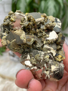 Stunning Peruvian Pyrite clusters with quartz mixed within. Some will also have sphalerite, galena, and pyrrhotite. Even some black ilvaite. These will be mostly gold and white in color, but some will also have black and white hues.  Amazing all over, and all of the minerals are growing together and mixing. Take a look at the video to see the tiny details as well as how each piece sits or lays.