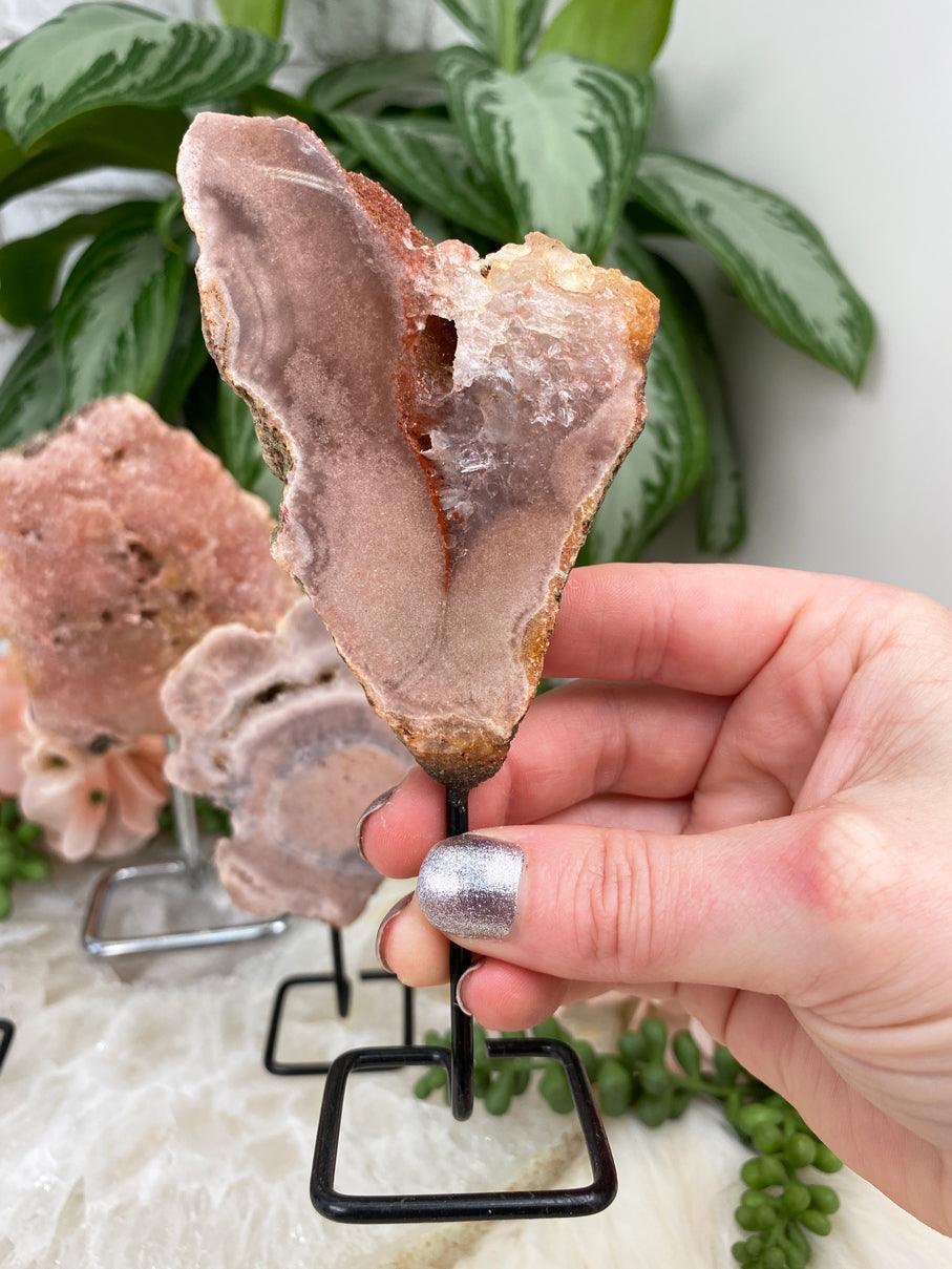 Cute little pink amethyst display crystals on metal stands. Pink amethyst is a form of amethyst that gets its color from hematite and iron in the crystal. Great pieces for a nightstand, side table, or desk. Most of these have a black metal stand, but the center one has a chunkier silver stand.