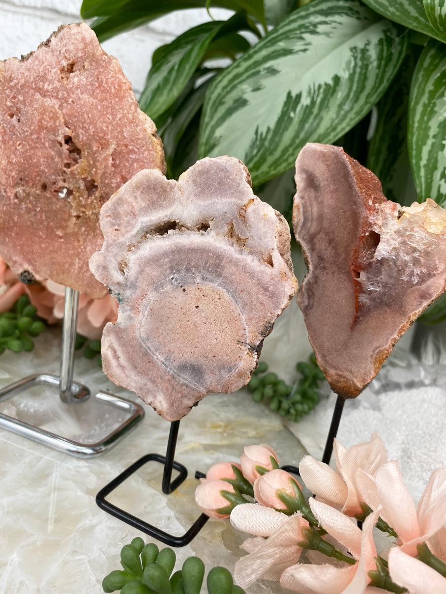 Cute little pink amethyst display crystals on metal stands. Pink amethyst is a form of amethyst that gets its color from hematite and iron in the crystal. Great pieces for a nightstand, side table, or desk. Most of these have a black metal stand, but the center one has a chunkier silver stand.
