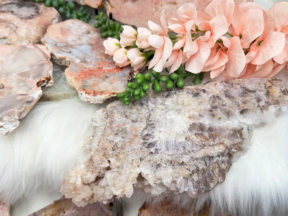 Stunning Pink Amethyst Slabs from Brazil in a variety of sizes, shapes, colors, and patterns. Be sure to check out the video for a full 360 view of each of the pieces. Some have druzy spots, some have white quartz, some have purple amethyst. A couple have more of a quartz look to them with less pink. A few of them have a raw back, so they will not sit flat like a traditional slab. These pink amethyst slabs are great for home decor. Feature on their own, or add a tea light or bud vase on it for a table center piece or side table. The stands are not included with the pieces, but are available on the website. The 'medium' should work for the larger slabs, and the small should work for most of the little ones.