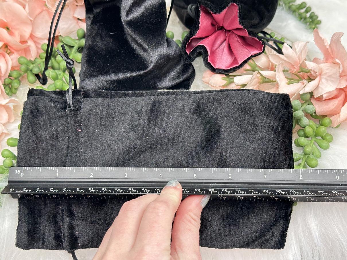 Cute little drawstring bags perfect for holding your tumbled crystals are little magical goodies. Â These bags are all black with a pink satin-y material. Â The material is a stiff velvety texture.