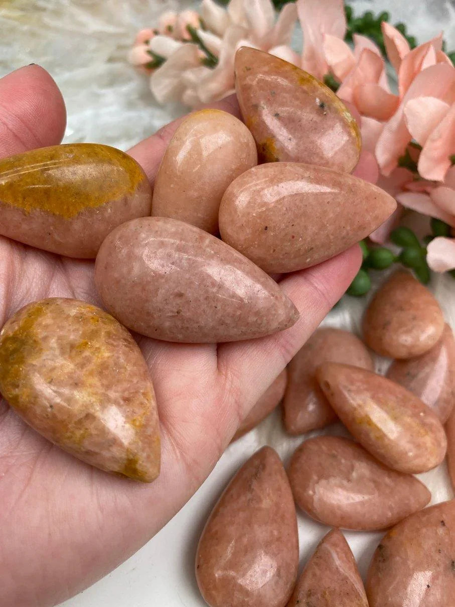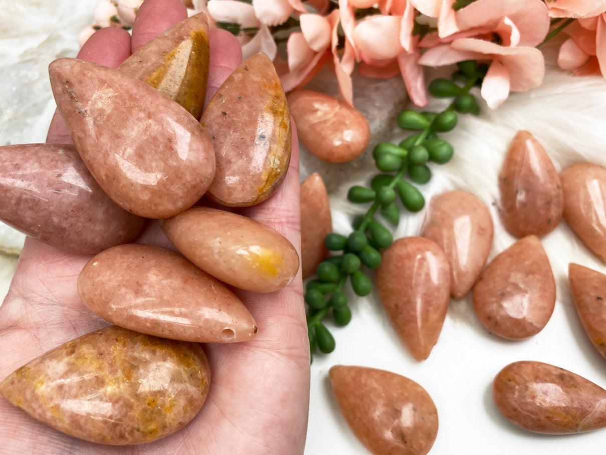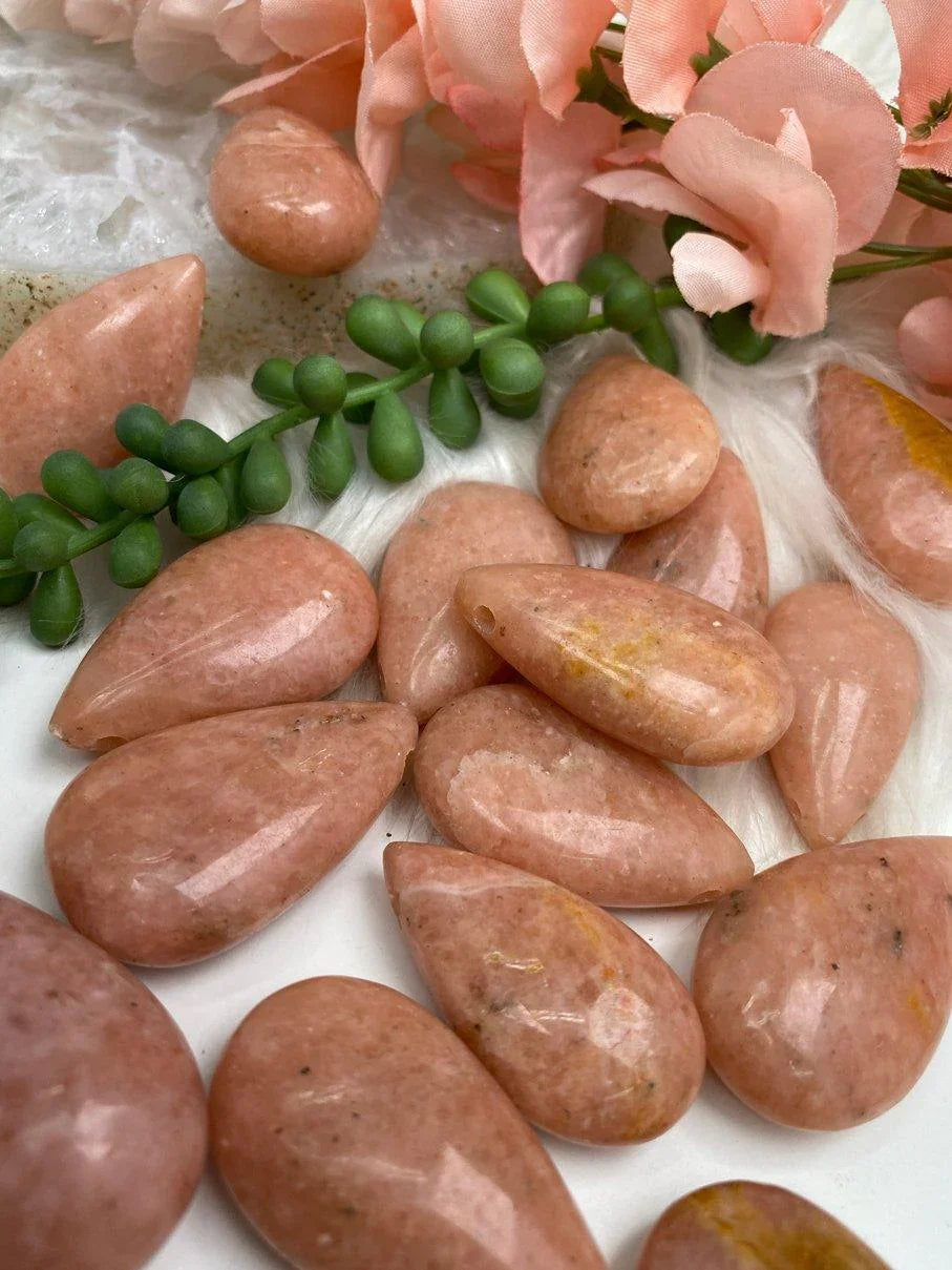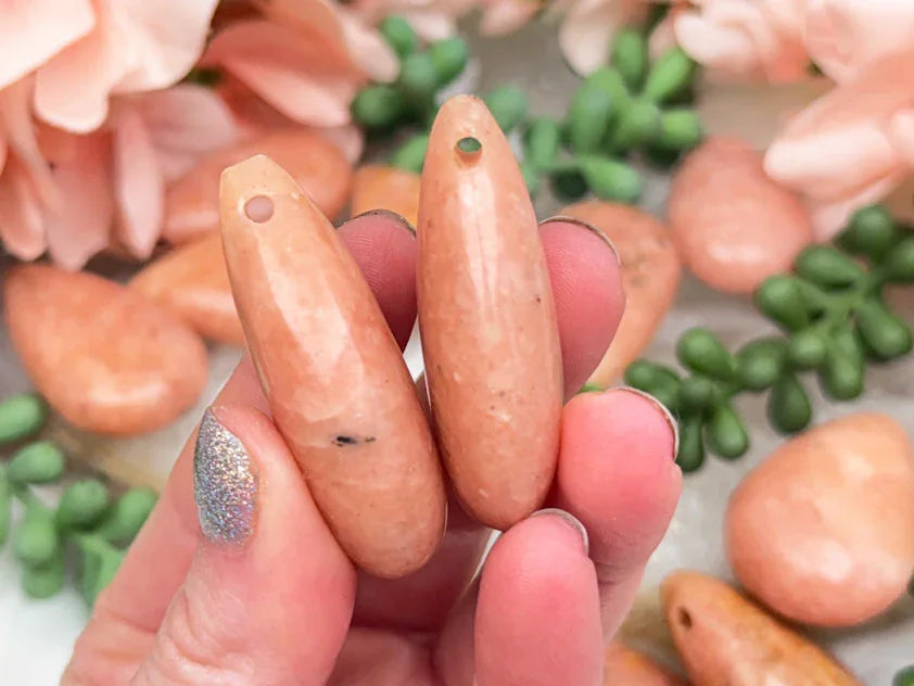 Adorable little light pink Cipolin pendants with a tear drop shape. Most of these stone pendants have a mix of the overall pink color, and some have hints of dark spots and/or some with yellow/orange iron inclusions. This stunning pendant is crafted from natural light pink Cipolin stone. Each piece is totally unique, as the stone is known for its mix of overall pink hues.
