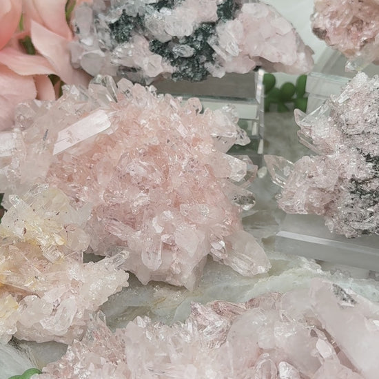 Pink Colombian Quartz clusters with a beautiful natural baby pink coloring, stunning formations, clarity and more. Some of these have double terminated points, some are self healed, some have rainbows, some have penetrator crystals, some have sparkly bottoms. All have a pink hue to them, some stronger than others. A few have dark green chlorite in them while some have a golden yellow from iron. One piece, 2nd row far left has a very very light almost white coloring to the quartz. Take a look at the video to see how they sit (or lay) as well as a full 360 look at each piece.