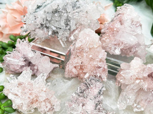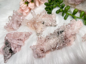 Pink Colombian Quartz clusters with a beautiful natural baby pink coloring, stunning formations, clarity and more. Some of these have double terminated points, some are self healed, some have rainbows, some have penetrator crystals, some have sparkly bottoms. All have a pink hue to them, some stronger than others. A few will have a tiny bit of dark green chlorite in them. Take a look at the video to see how they sit (or lay) as well as a full 360 look at each piece.