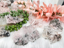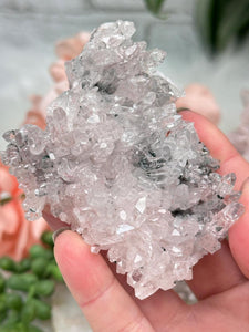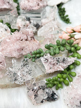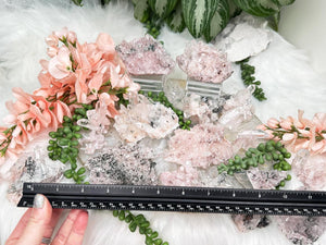 Pink and green Colombian Quartz clusters, many with green chlorite contrasts in addition to stunning formations, clarity and more. Some of these have double terminated points, twins, bridge points, some are self healed, some have rainbows, some have penetrator crystals. Some have tons of the green chlorite, while some have just a little bit or none at all. Take a look at the video to see how they sit (or lay) as well as a full 360 look at each piece.