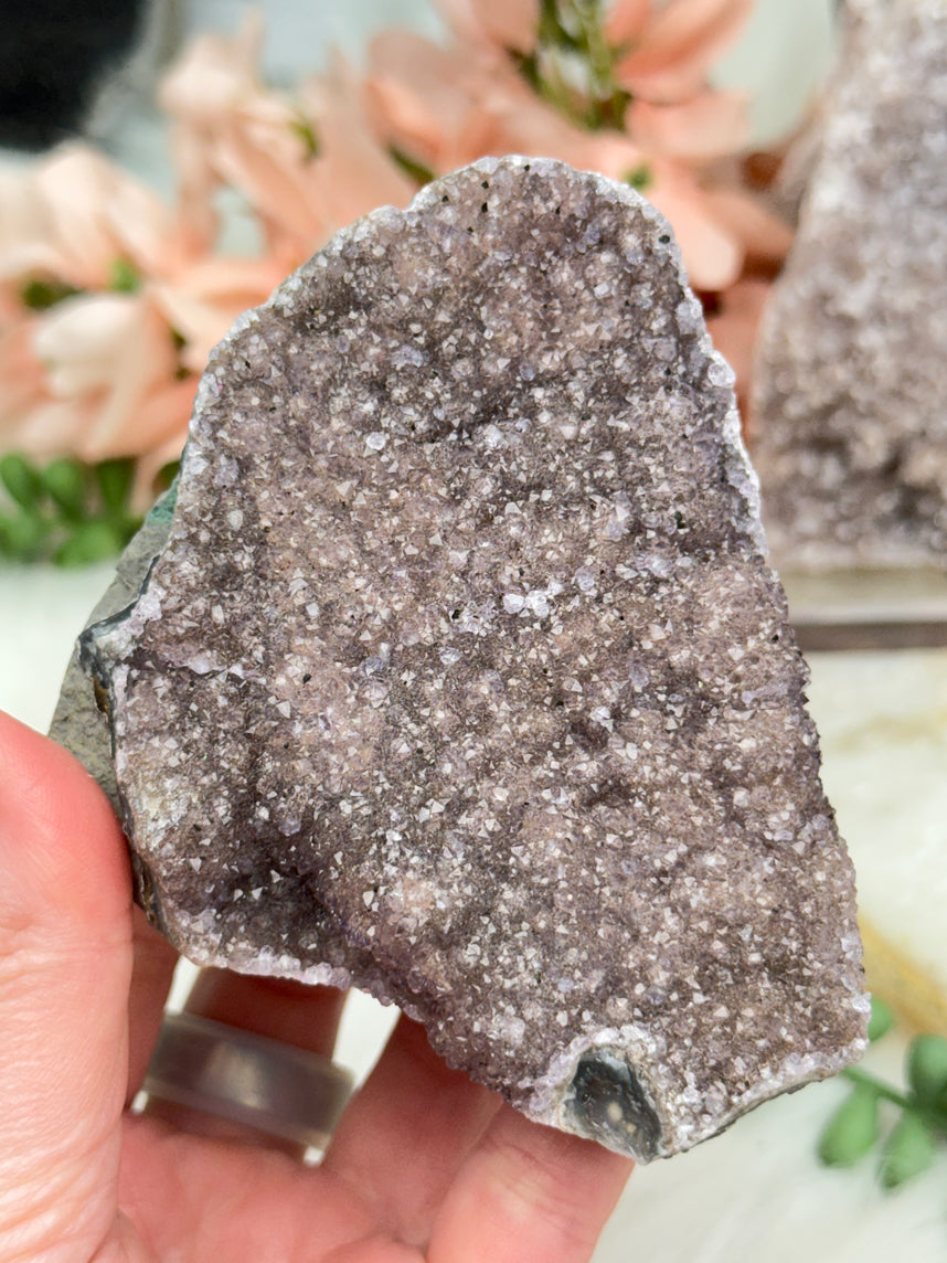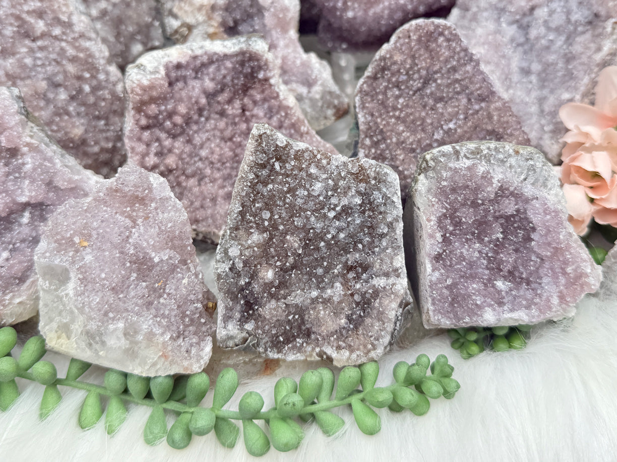 Adorable Pinkish Purple Amethyst clusters from Brazil. These little babies are a great addition to just about any home decor theme. They get the mauve and dark coloring from hematite inclusions, some are definitely lighter than others, some have a purple shade and some are more of a tan, and some almost red.  Such great sparkle! These have raw sides and some cut sides, so some can sit a couple ways. Take a look at the video to see how they stand. The piece that is 'second row far left' sitting on the fabric can possibly stand, but only leaning against something.