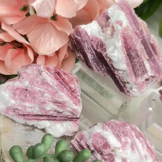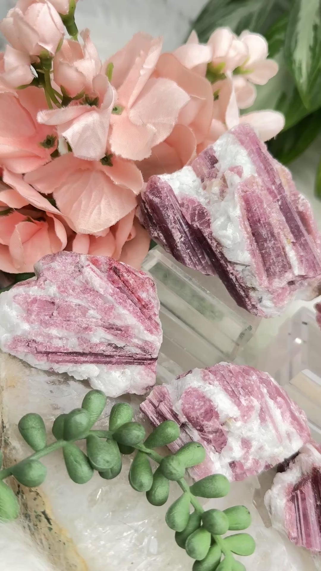 Cute little pieces of raw Pink Tourmaline crystal rods in White Albite from Brazil. These raw crystals have a wonderful pink and white contrast with a calm and loving crystal energy to them. The back right piece has a little bit of a purple hue from lepidolite in the albite. They are great pieces to have around your space as crystal home decor or for a special altar space.