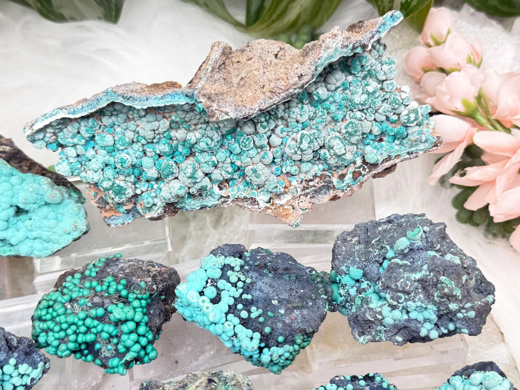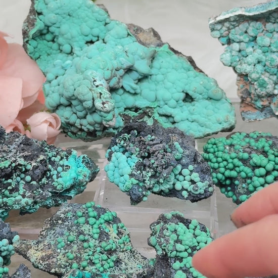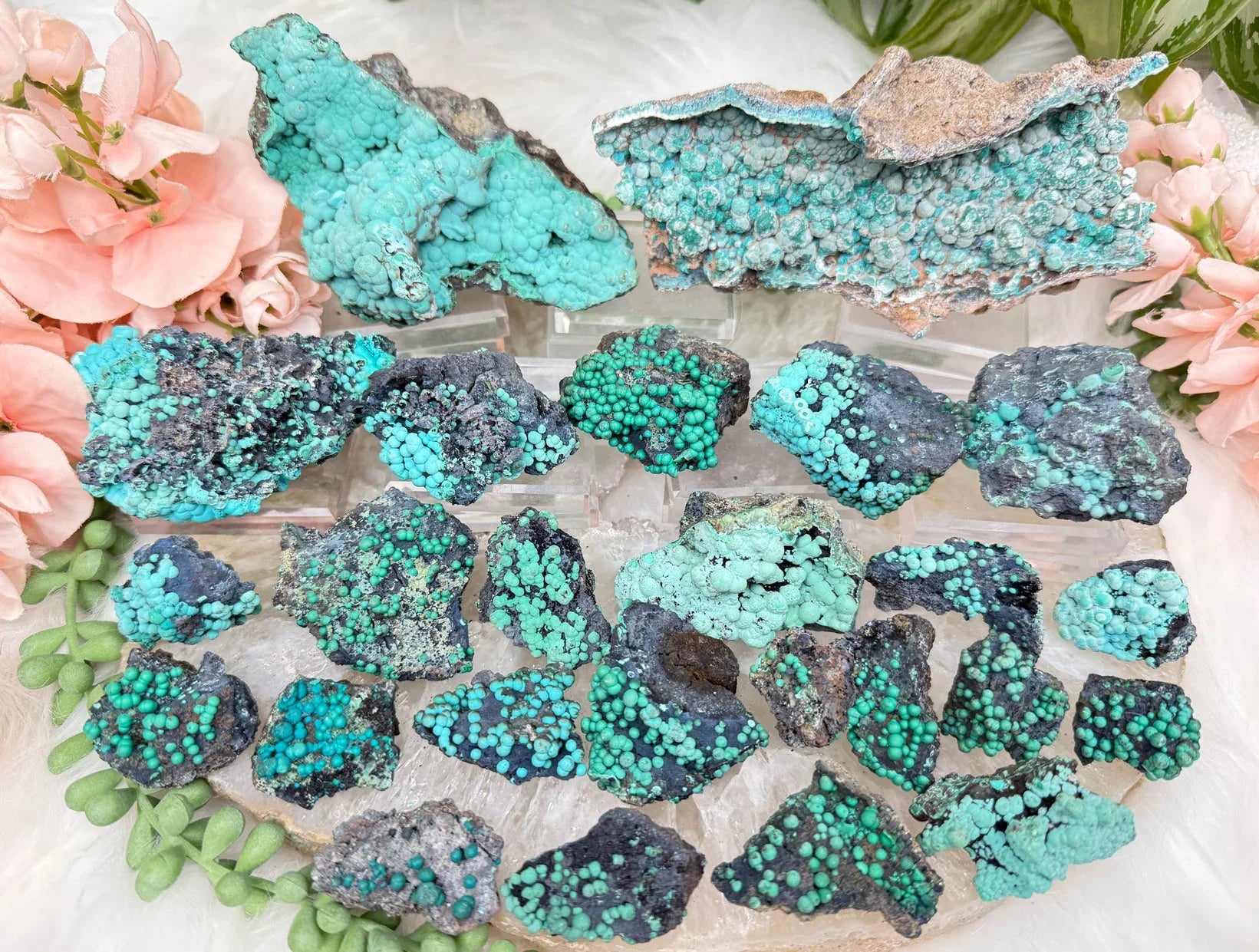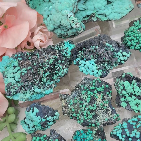 Stunning chrysocolla from the Planet Mine in Arizona!! These have become quite popular, although still not widely available. The Planet Mine Chrysocolla is know for it's bodryoidal (ball) formations of vibrant blue chrysocolla typically on a dark matrix, giving them a stunning contrast. Some of these will be bright blue, some a deep blue, and some more of a turquoise coloring and even some that are green due to their malachite inclusion. A couple even sparkle under the right light! Take a look at the videos to see each piece 360 as well as how they sit. There are two videos.