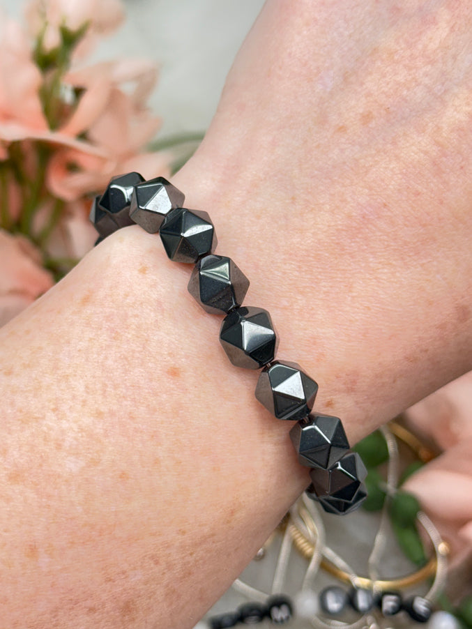 - Bolo style bracelets in obsidian and hematite. Silver alloy metal.