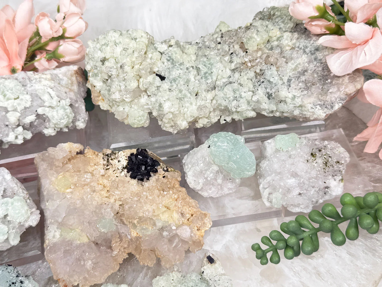 Beautiful white and green quartz and prehnite clusters from China. Many of these pieces also have a dark green Babingtonite as well (sometimes it looks nearly black). Take a look the videos to see each of these pieces in a full 360, and also to see if it can stand on a side or how it sits or lays. Each one is super unique and beautiful in its own way!