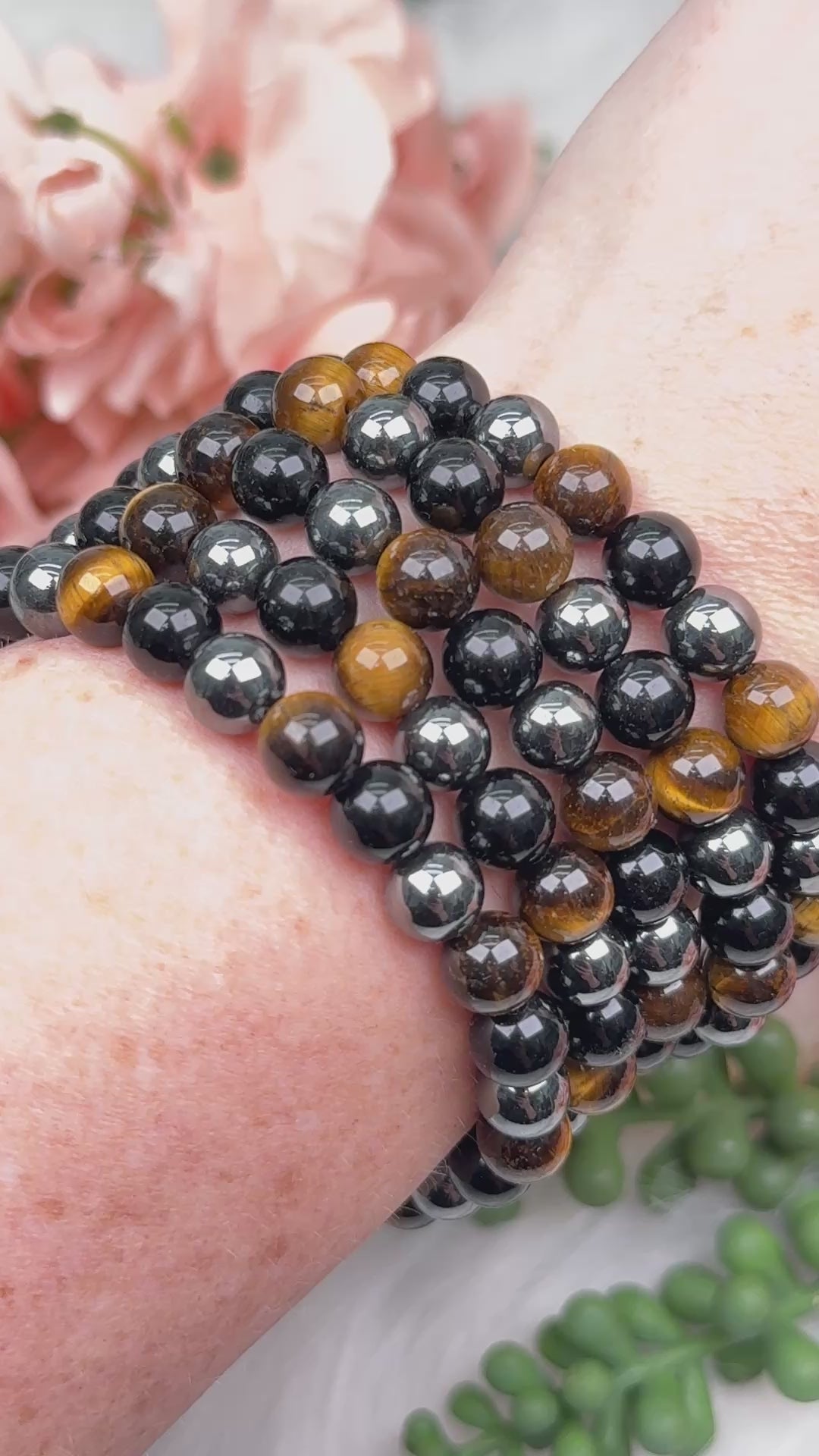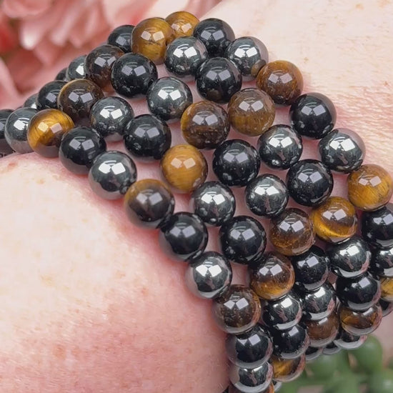 Carry protective energy with you in style with this Protection Bracelet made from alternating tiger’s eye, hematite, and obsidian beads. The warm brown and gold tones of tiger’s eye combine with the dark, grounding look of hematite and obsidian for a balanced, intentional design that feels strong yet wearable. Each 8mm bead is strung on a stretch cord, making the bracelet comfortable, versatile, and easy to wear every day.