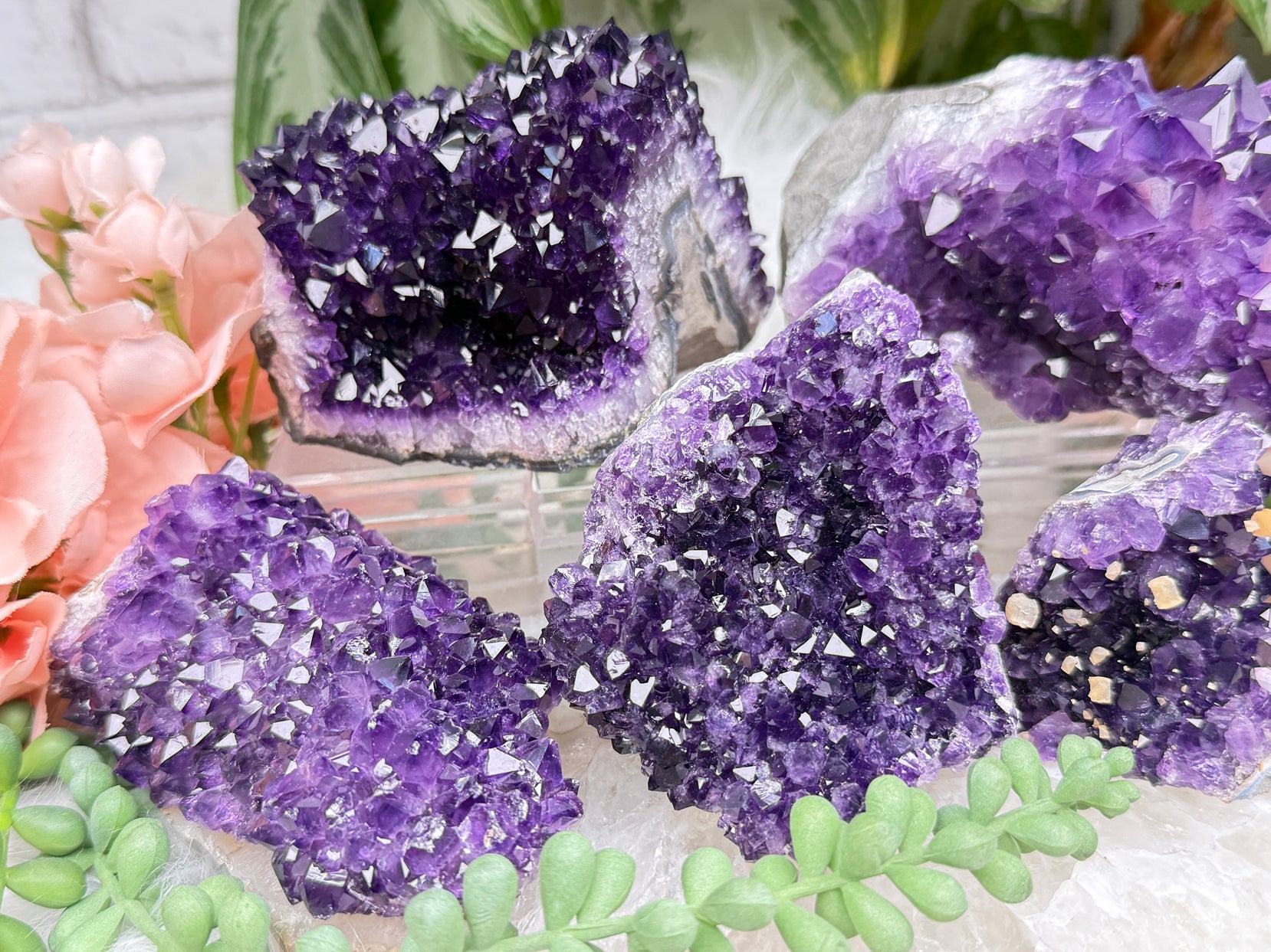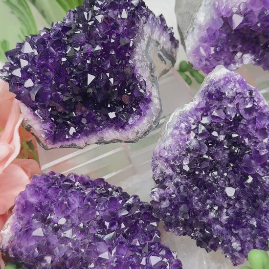 Stunning deep purple amethyst from Uruguay. These all have a stunning naturally saturated color to them. The smallest one also has some yellow calcite on it. Take a look at the video to really see them in action and a full 360 view of each piece. There are chips and nicks to the points on most of these, so look closely at the video if that is of importance to you. I think they are all still beautiful!