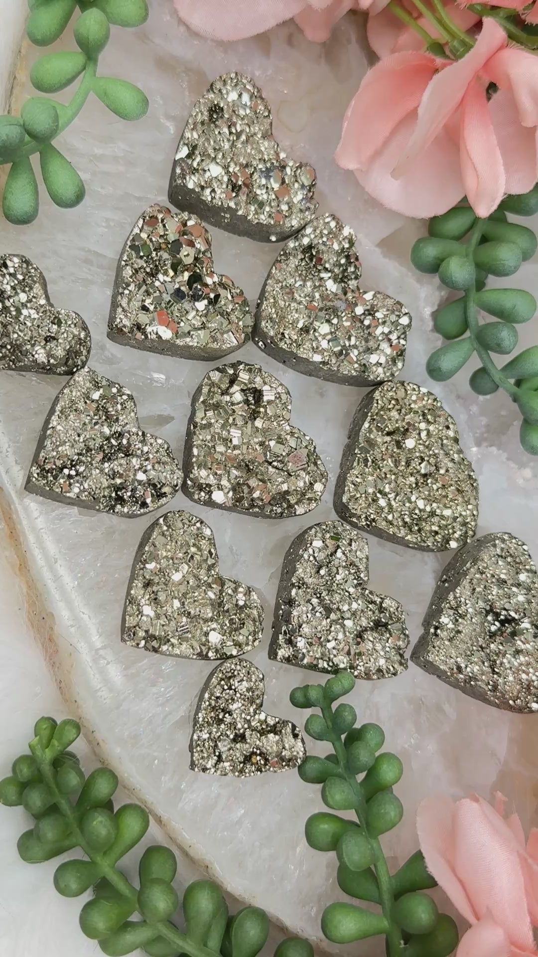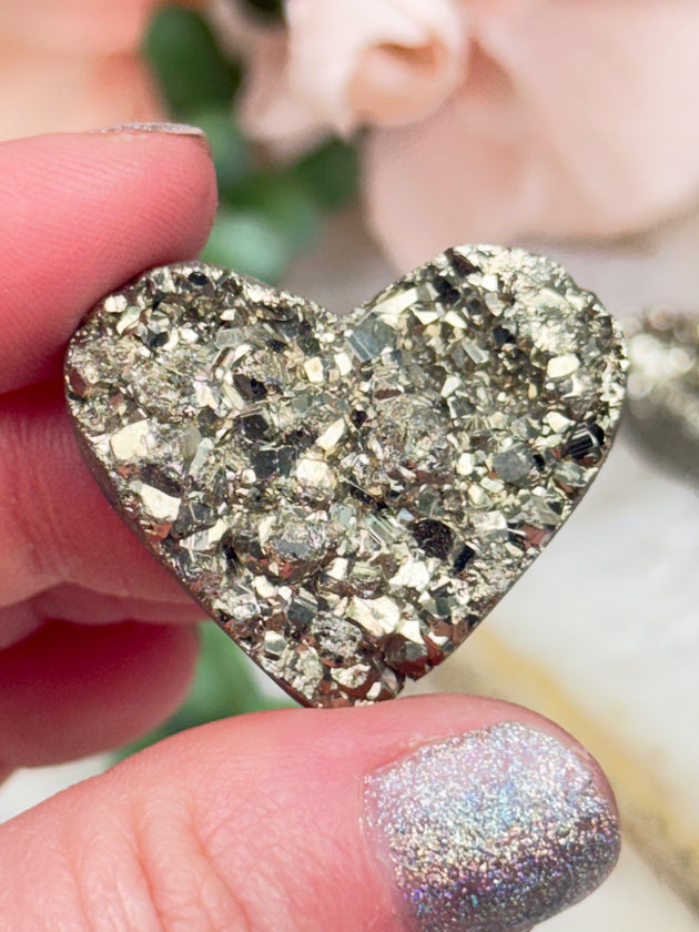 Adorable gold Peruvian pyrite heart crystals with full sparkle faces! These beautiful pyrite hearts are from Peru, known for their gold pyrite.  They have carved sides and flat backs, so they would even be great for jewelry as a cabochon! All unique in their own ways. Check out the videos to really see these pyrite hearts in action! Â