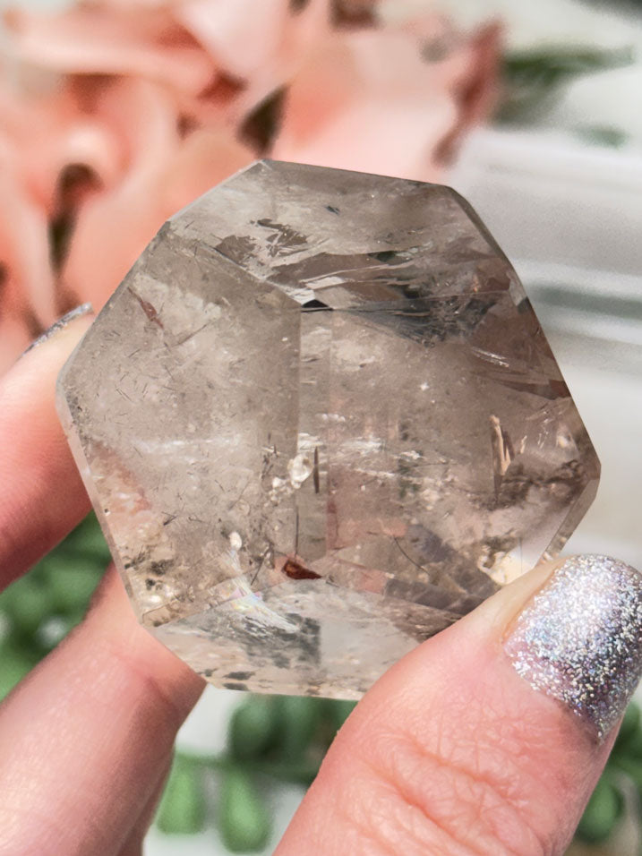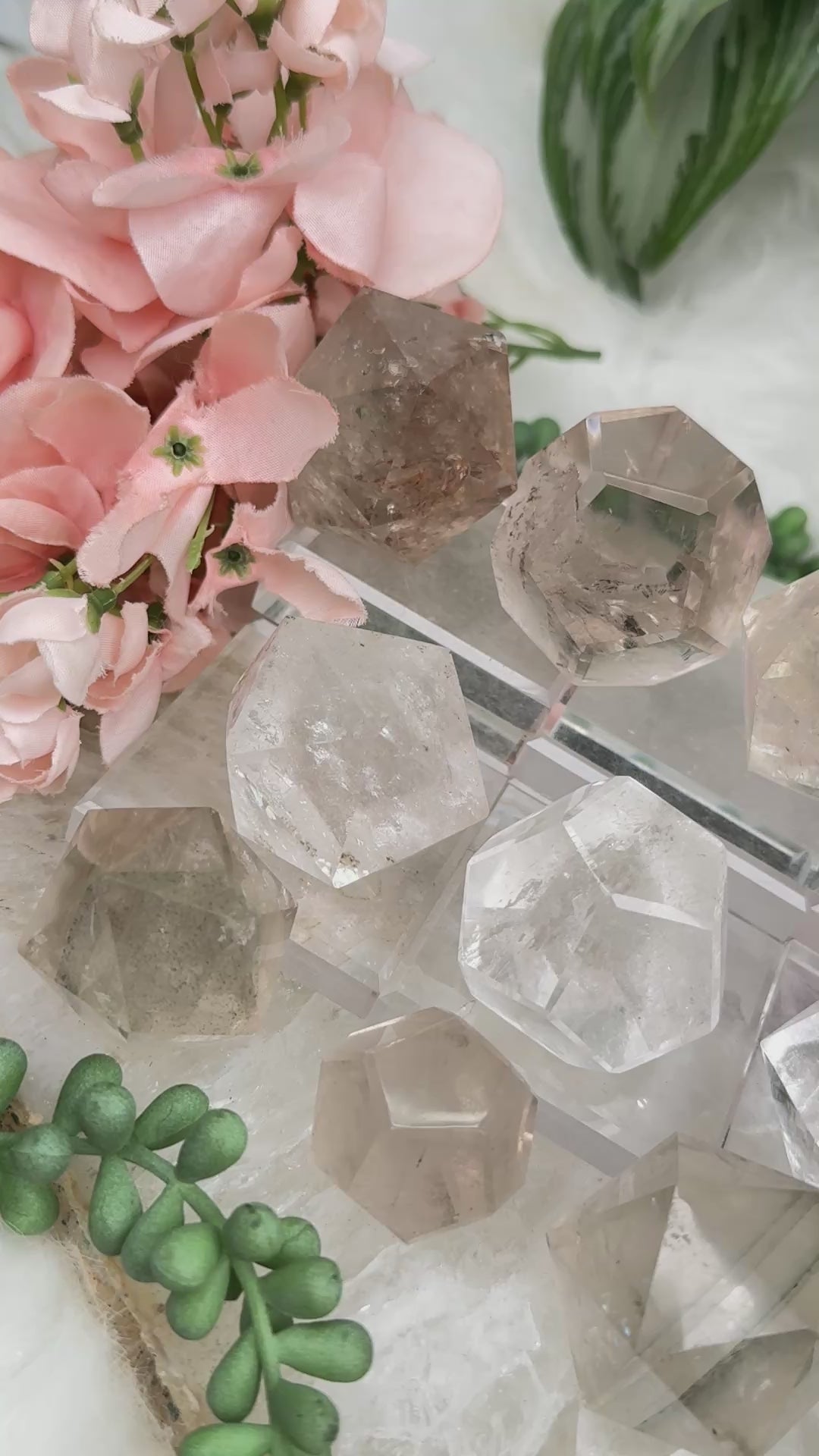 Adorable quartz and smoky quartz dodecahedron and icosahedron crystal carvings from Brazil. You get to choose your exact piece! Some of these will also be mixed with chlorite (causing a phantom), and maybe a couple other inclusions. There are some minor chips on some of these, so be sure to see the full 360 degree look on all of the pieces in the video. Oh and you'll get to see some rainbow action that a few have!!