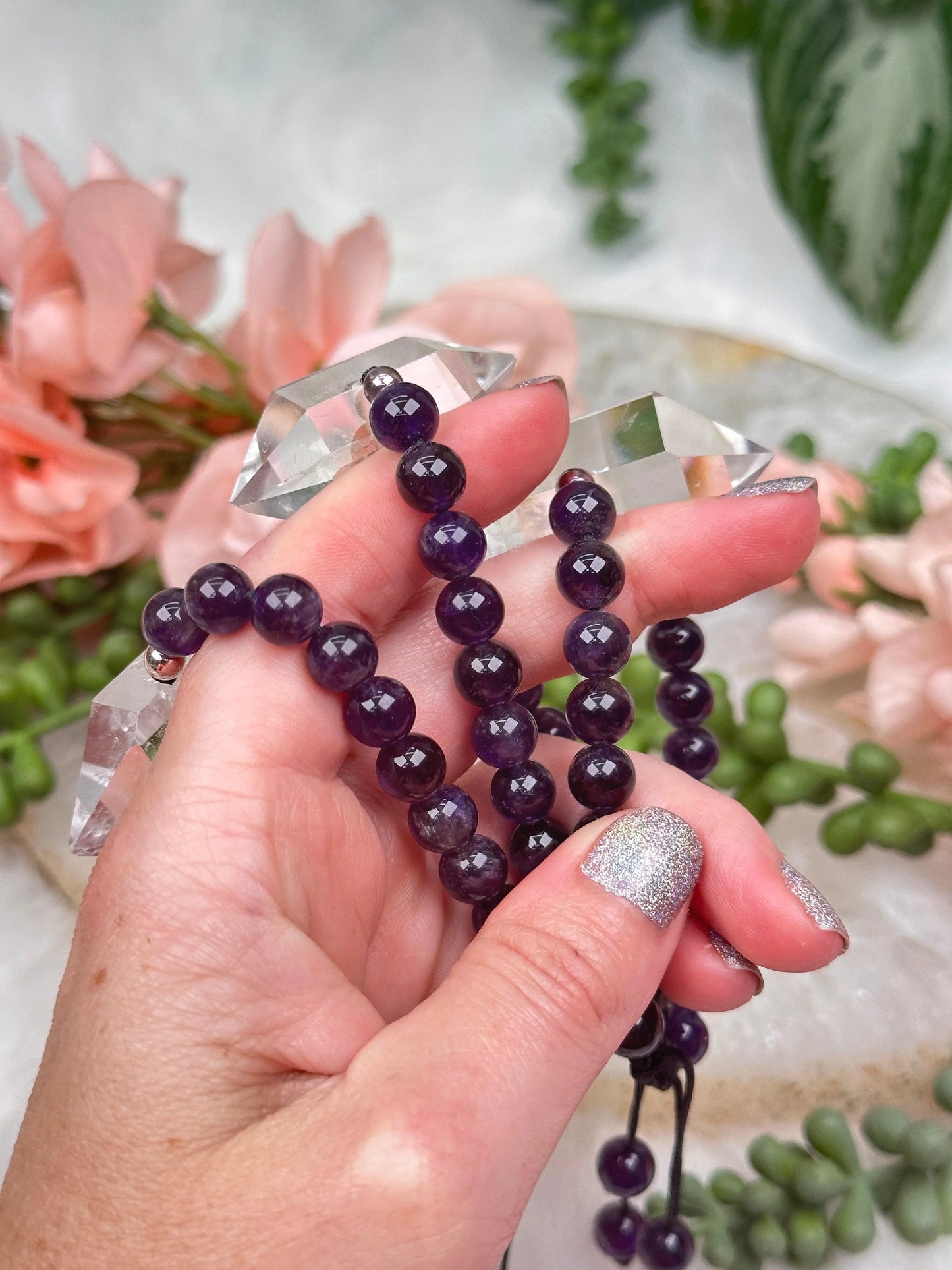 These beautiful quartz point bracelets make for a unique crystal gift that will make anyone happy to receive them. Comes in different natural stone options, all featuring a double terminated point and drawstring closure. Carry your protective energies with you in style with this modern crystal mala bracelet design!