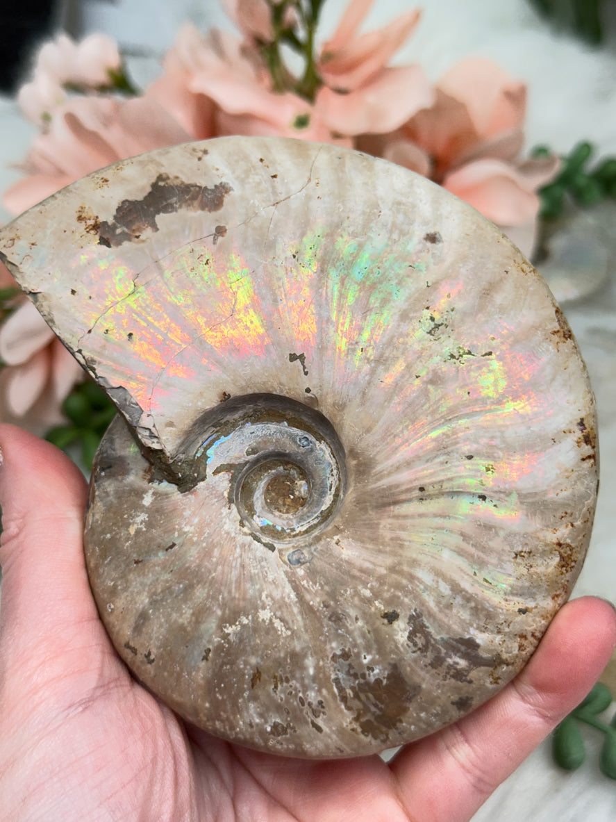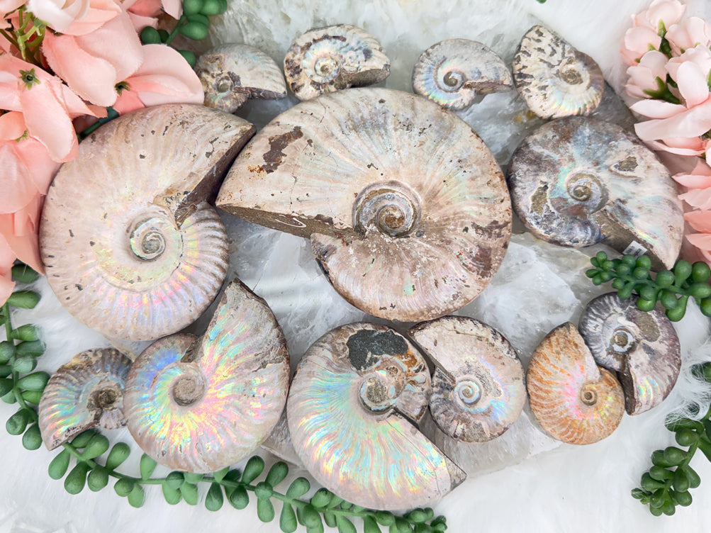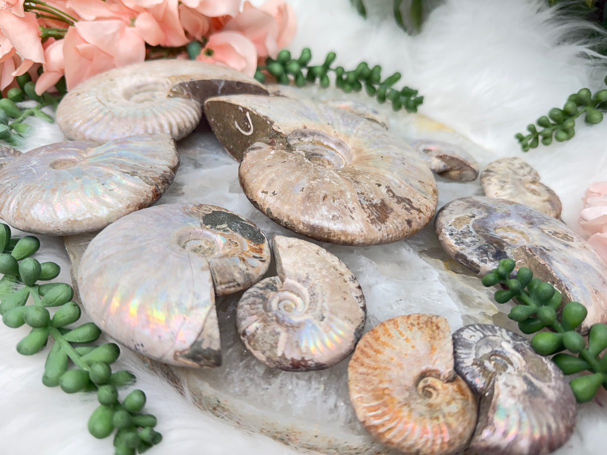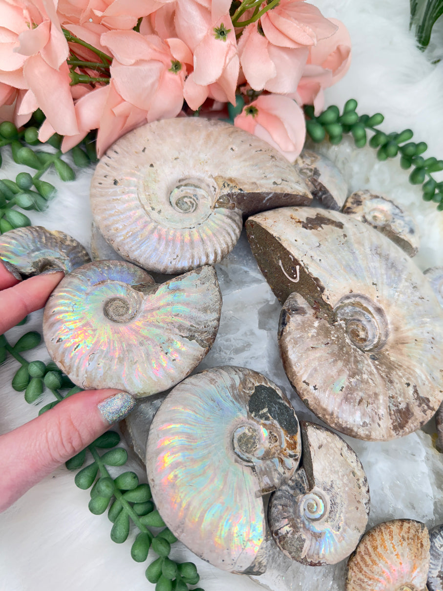 This gorgeous fossilized creature features a stunning iridescent sheen that changes colors in the light, and its spiral shape symbolizes continual change and evolution. Some are flashier than others. There are chips one these, so by no means are they in perfect condition, but still awesome!