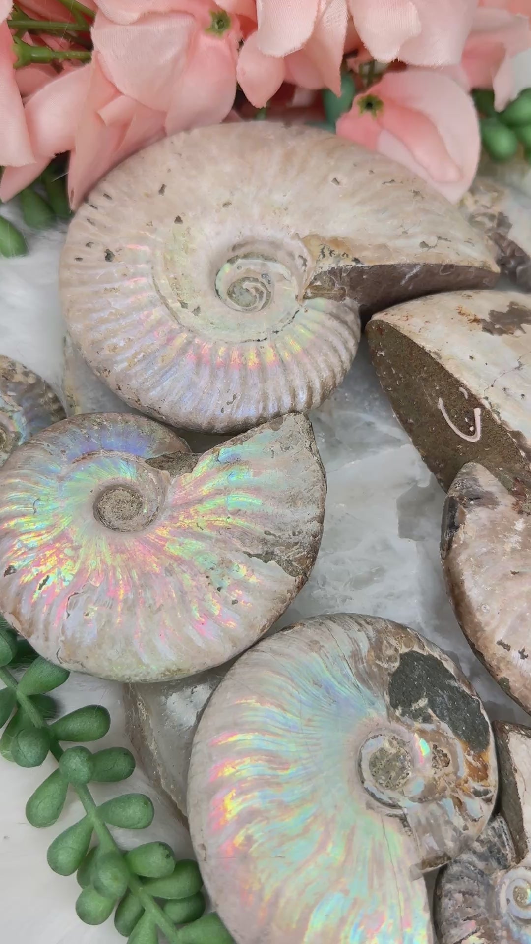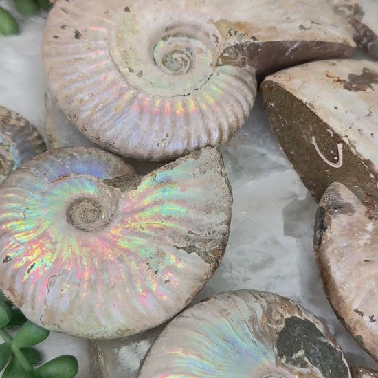 Colorful Ammonite fossils from Madagascar.  Each ammonite is a slightly different size and color vibrancy, but overall have a similar appearance.  These ammonites are an over all tan color and flash a variety of colors at the right angle. Be sure to check out the video to see each piece in a 360 view for the best look at the flash!