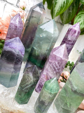 Purple and green Chinese fluorite points with a variety of colors, patterns, and sizes. Some will be mostly purple, some will be mostly green, and some are both! Please note that quite a few of these either wobble or sit at an angle, so take a look at the video to see them in action. Some also have some chipped points and edges, so look closely at the videos for that as well.
