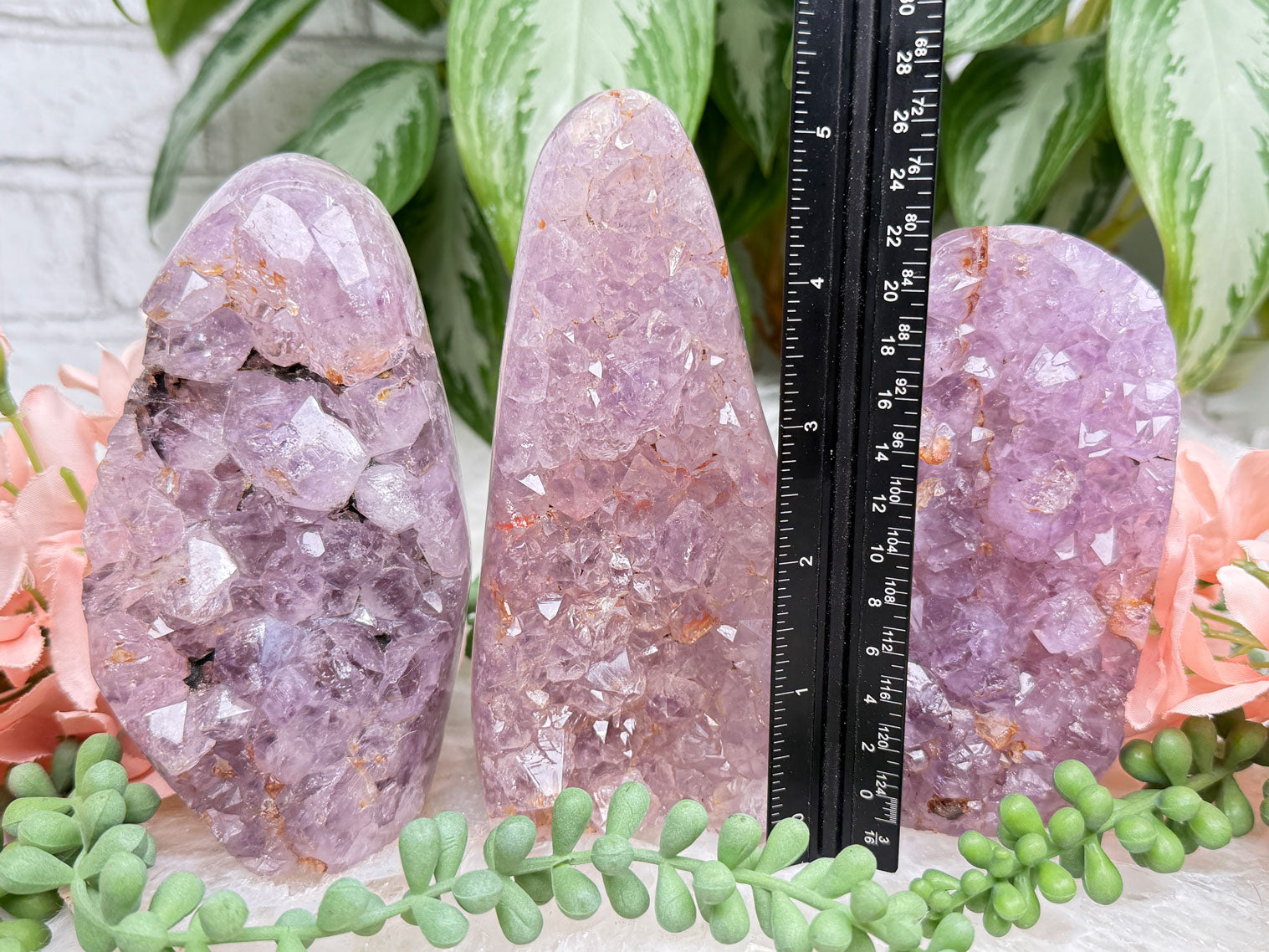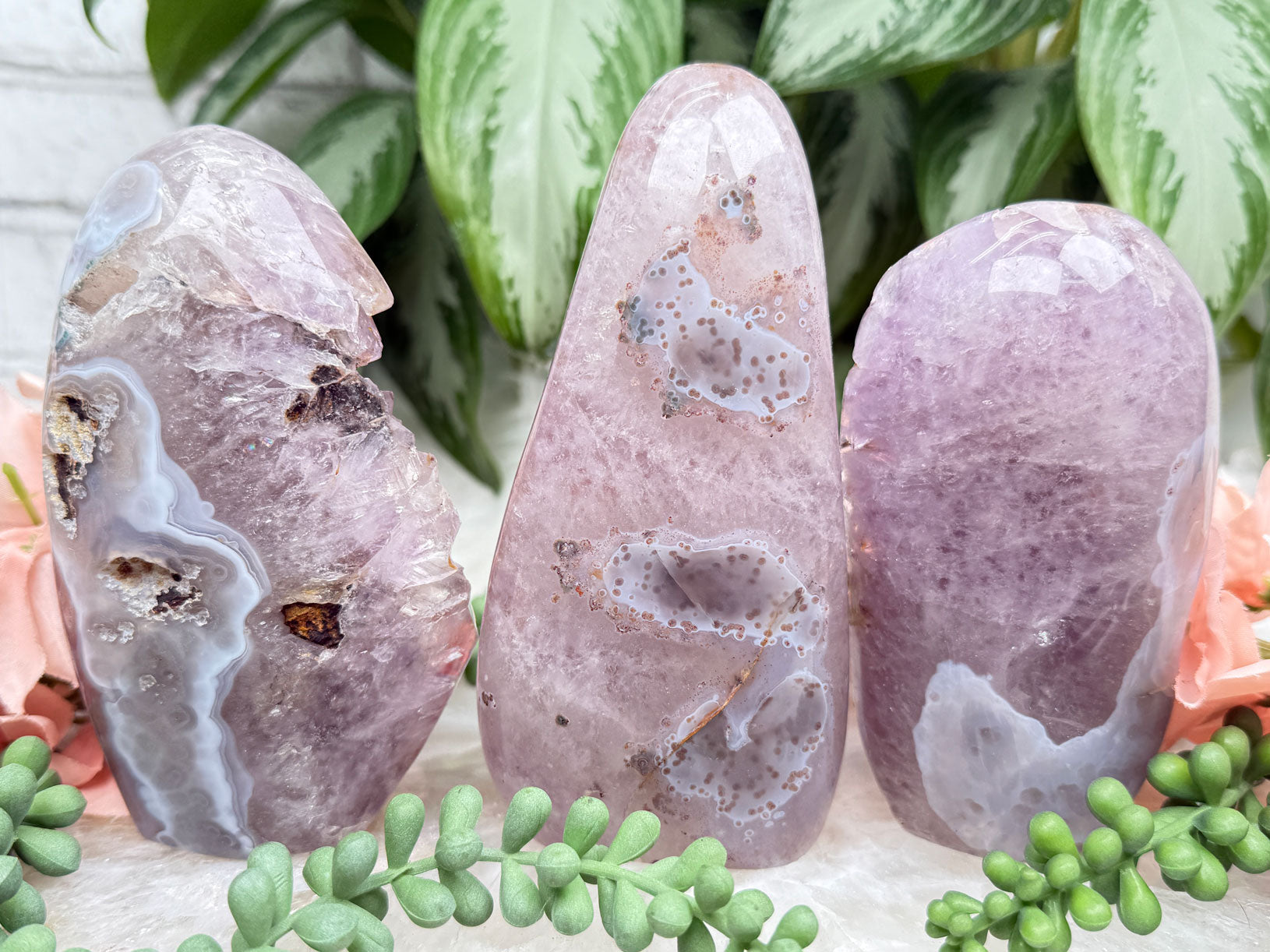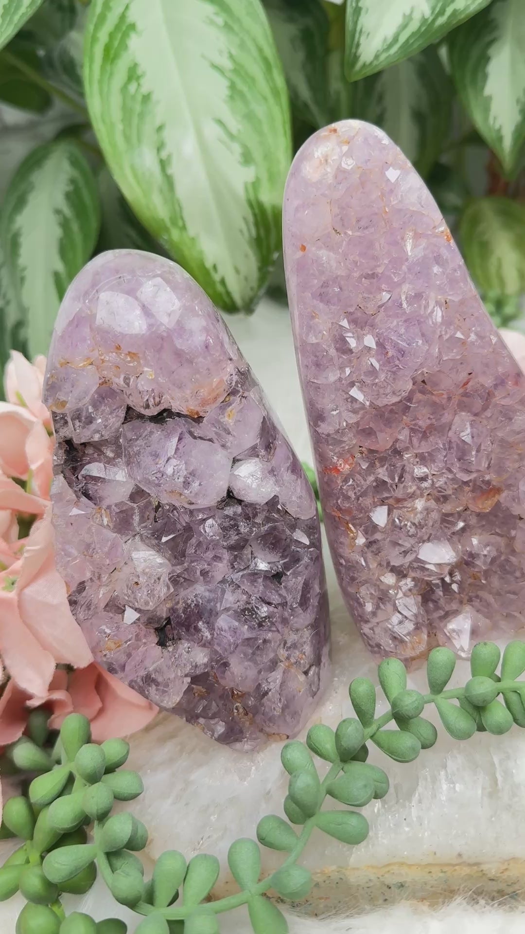 Beautiful and unique Amethyst freeform crystals from Madagascar with some iron mixed in causing yellow and black markings. These pieces are all full polished on the back, with a raw cluster face, and self-standing. Some have some great clarity within them, and some show a bit of an agate marking on back. They are truly all unique in their own ways be it cut, color and size.
