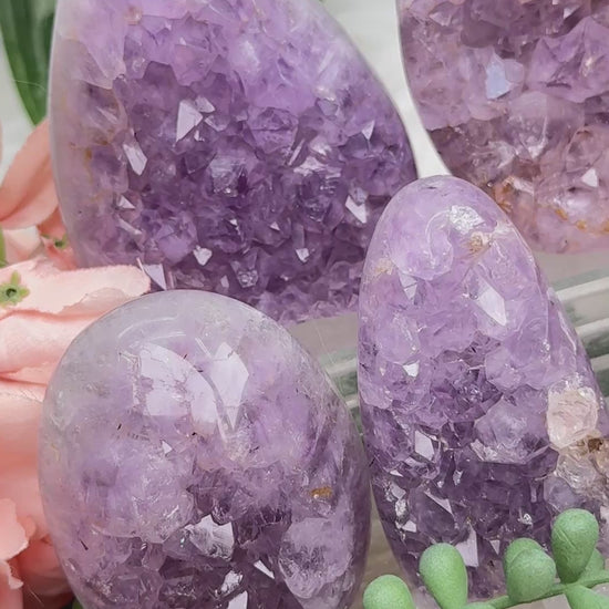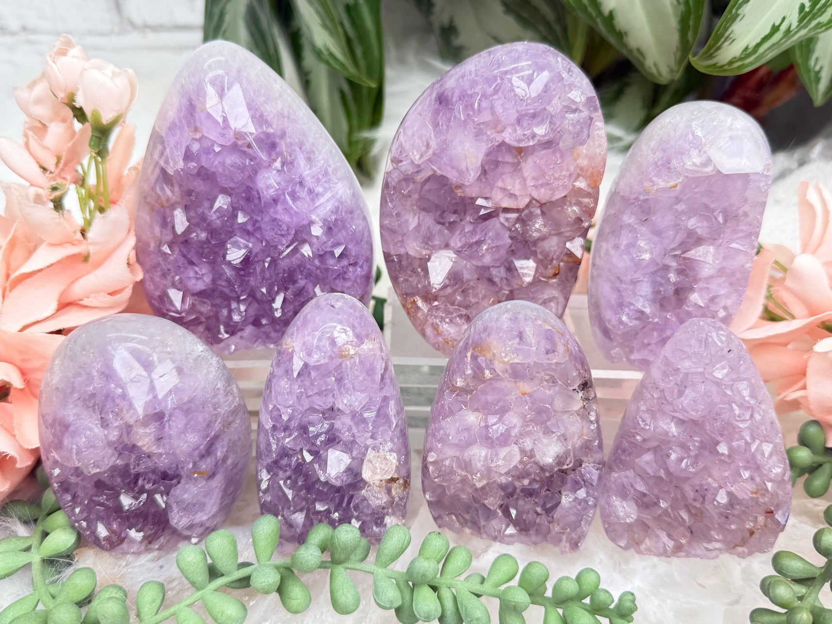 Beautiful and unique Amethyst freeform crystals from Madagascar with some iron mixed in causing yellow and black markings. These pieces are all full polished on the back, with a raw cluster face, and self-standing. Some have some great clarity within them, and some show a bit of an agate marking on back. They are truly all unique in their own ways be it cut, color and size.