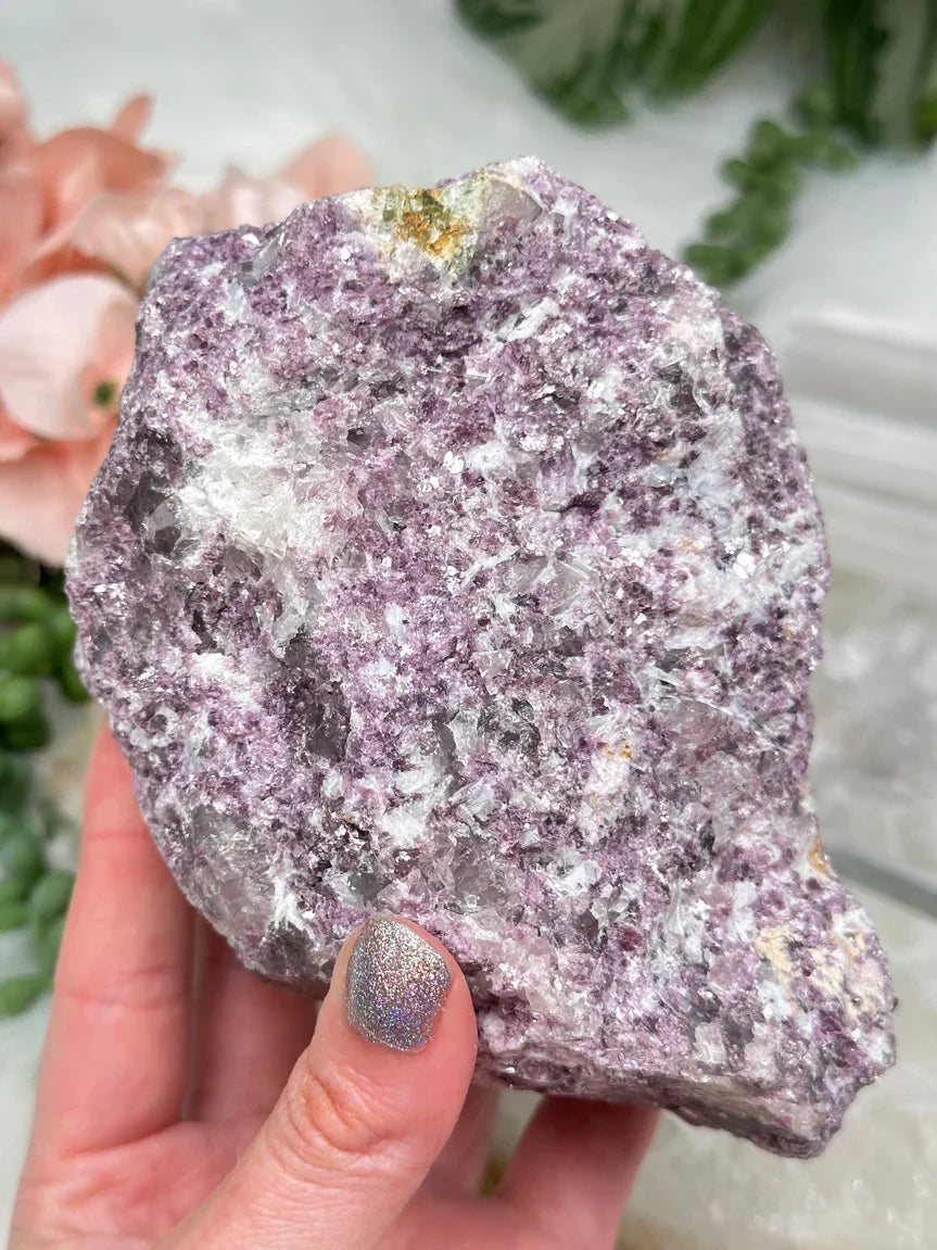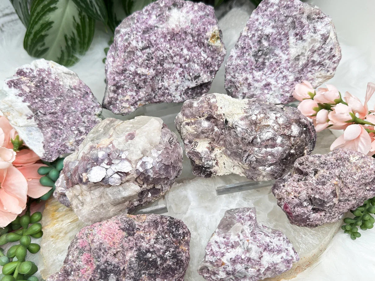 Unique raw purple lepidolite clusters with a mix of inclusions from Brazil. Four of these have purple lepidolite mixed with white albite and quartz, two are botryoidal or 'bubble' lepidolite (the two in the middle row), and two of them are lepidolite mixed with pink tourmaline and quartz. All are unique in their own ways, but they all sparkle or shimmer. Be sure to look at the video to see each in detail.
