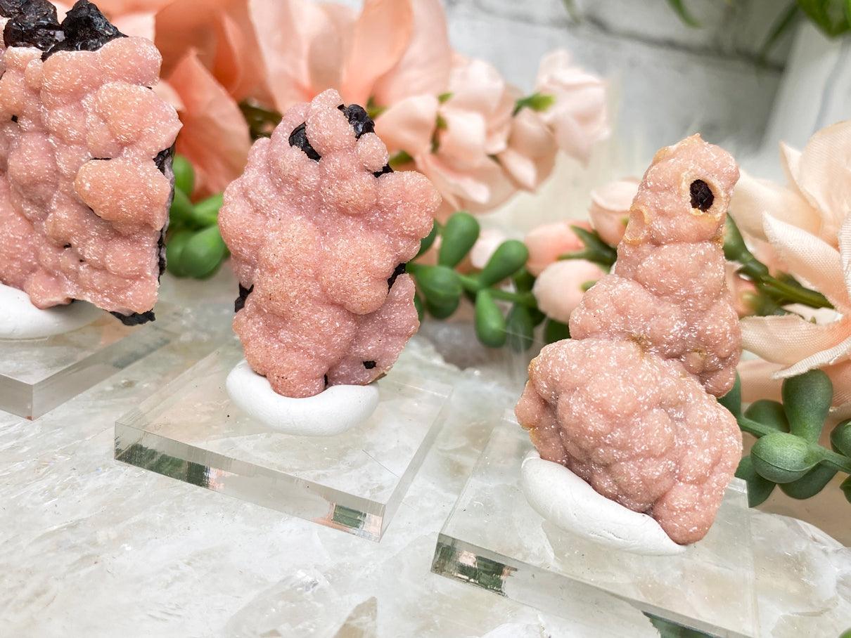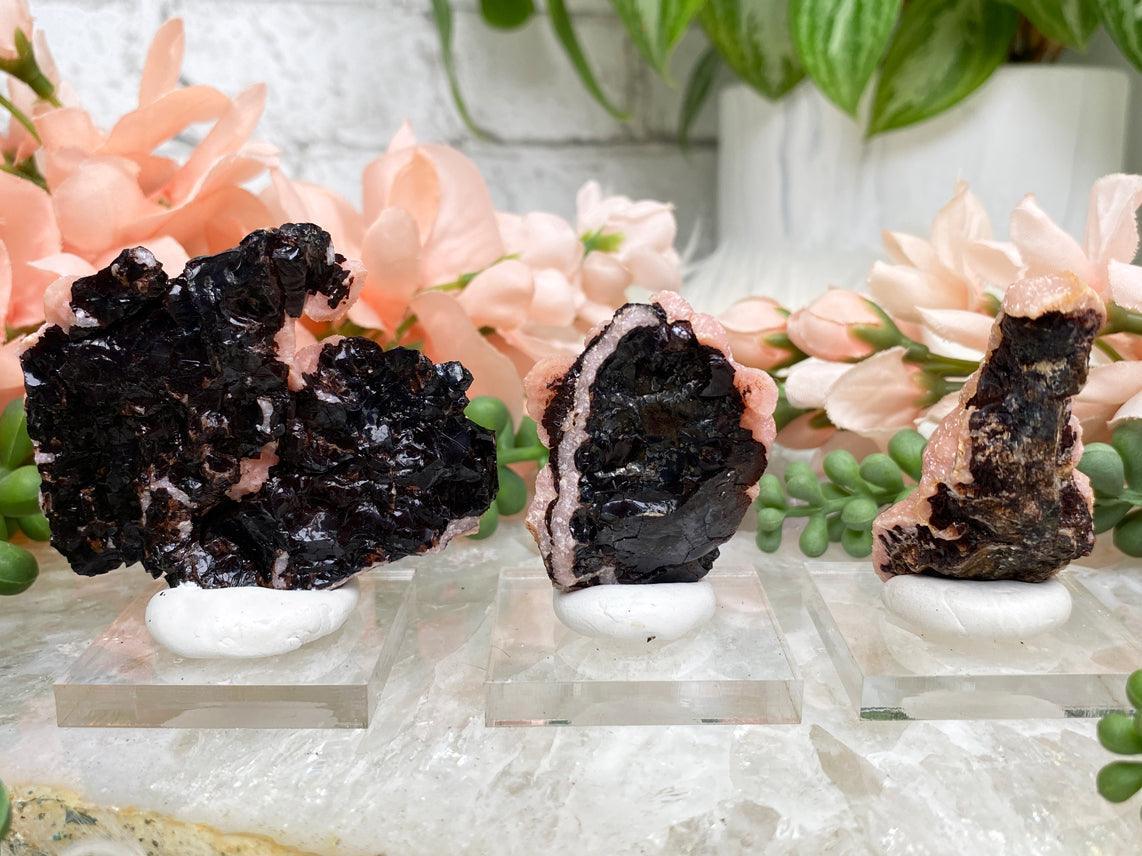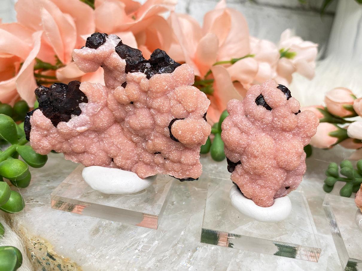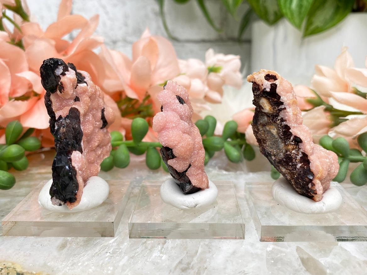 Stunning raw pink rhodochrosite specimens from Chihuahua, Mexico. These collector's pieces are tiny but mighty, and I LOVE their contrast of colors. The matrix is a bit of a brown black coloring up close, but overall looks black in comparison to the pink. The mineral is a bit of debate as some say it is galena, some say goethetite, and some say hematite. So I'll be honest, I don't know on that aspect.