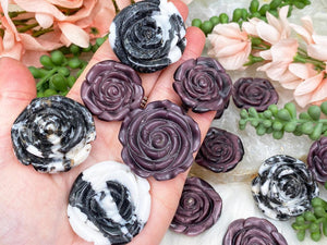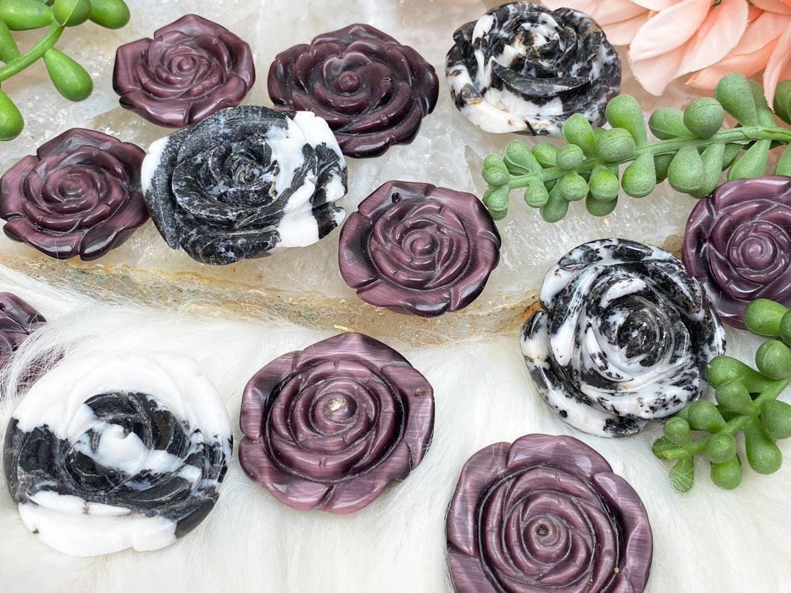 Cute rose or flower carved pendants in black and white zebra jasper or purple cat eye options. The zebra jasper is a natural stone, and the purple cat eye is manmade. The jasper is available in one size option, and the cat eye is in two. The holes in these are different from each other. The jasper ones are a slide through on the back (two holes), and the cat eye ones have a single hole that shows on the front.