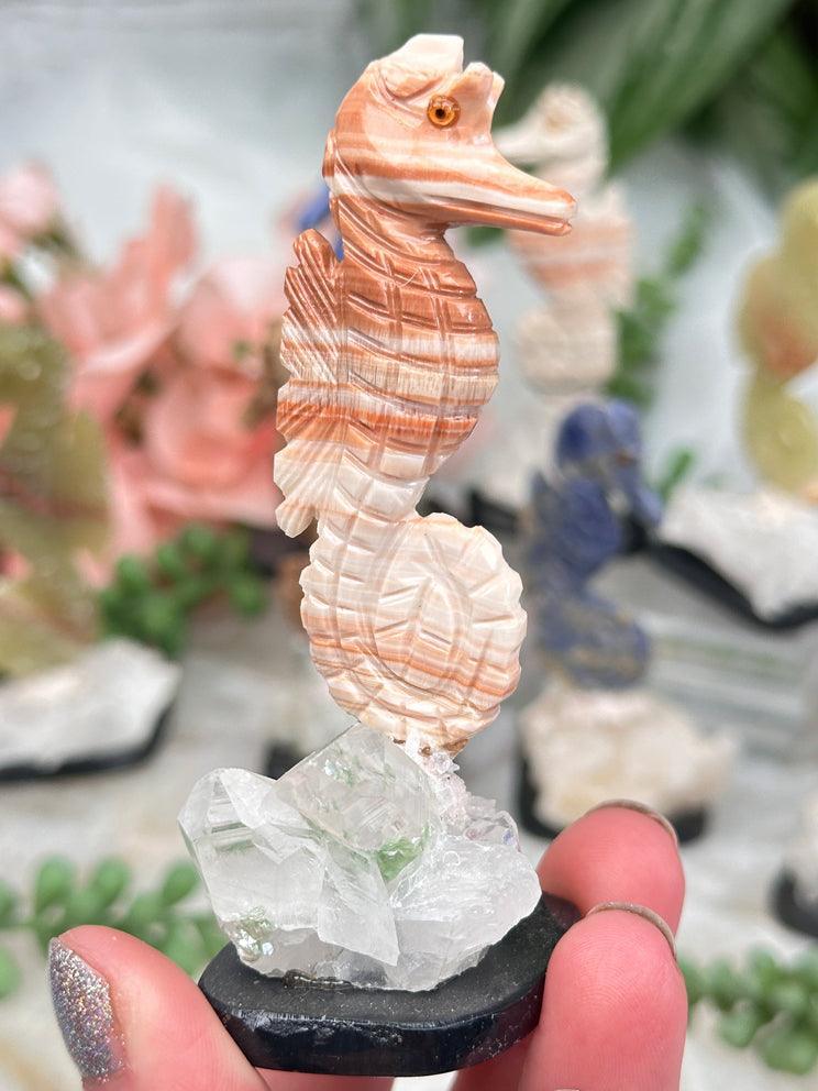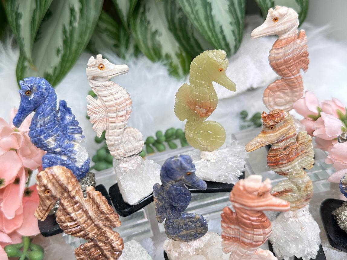 Adorable and unique seahorse crystals handmade in Peru from a mix of materials like pyrite, quartz, sodalite, onyx and aragonite. You will get to choose your exact piece! All of the bases are either gold pyrite or clear quartz, some of the quartz has a little green fuchsite in them. The seahorses are made of blue sodalite, green, orange and tan onyx, or brown aragonite. All of the crystals are also from Peru.