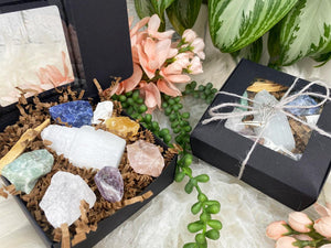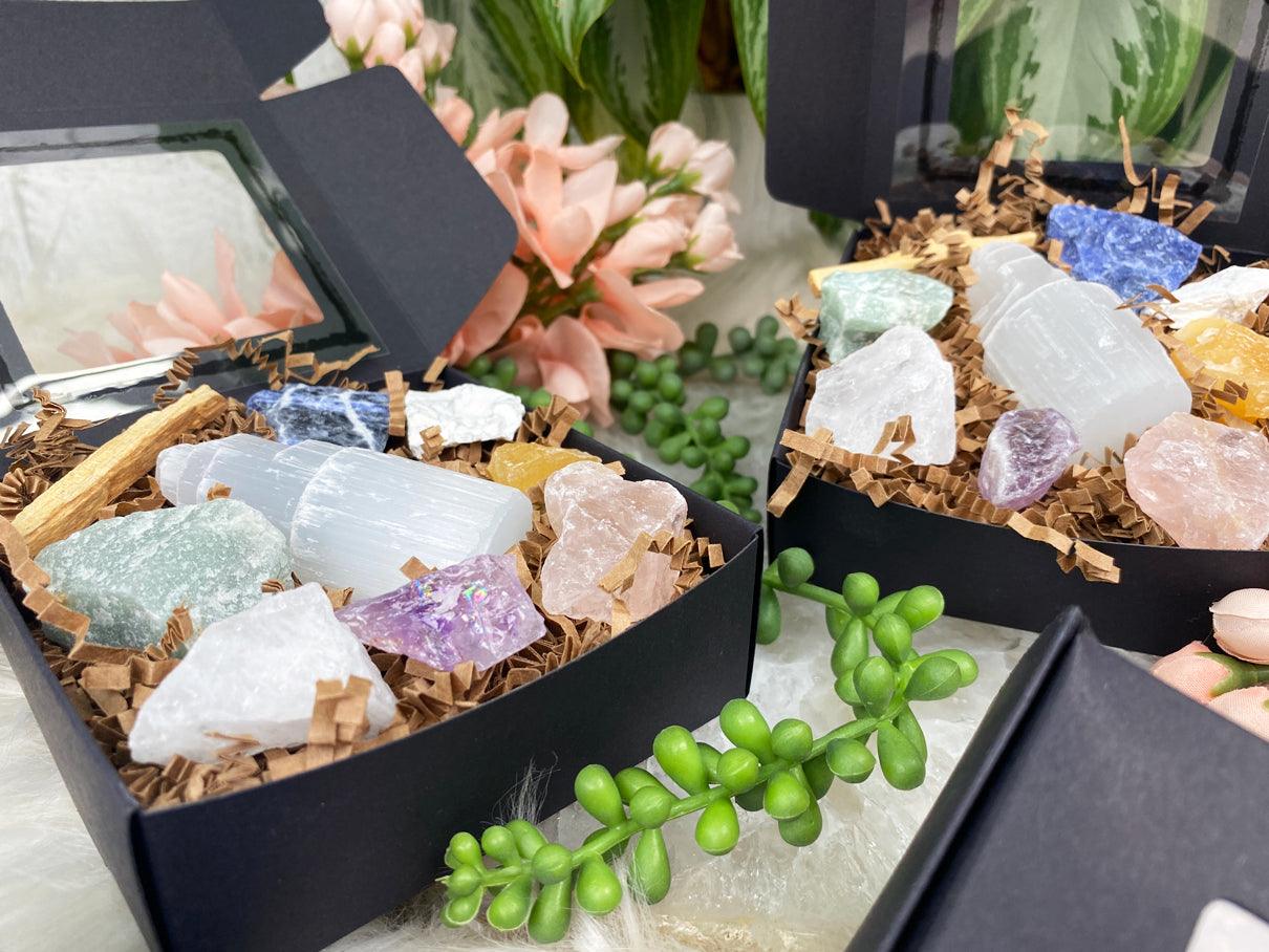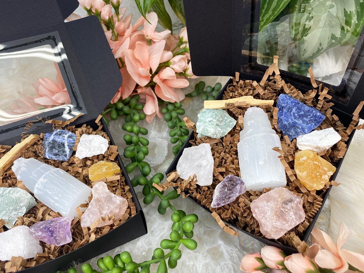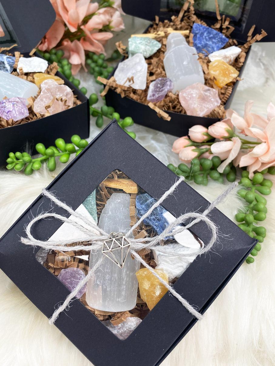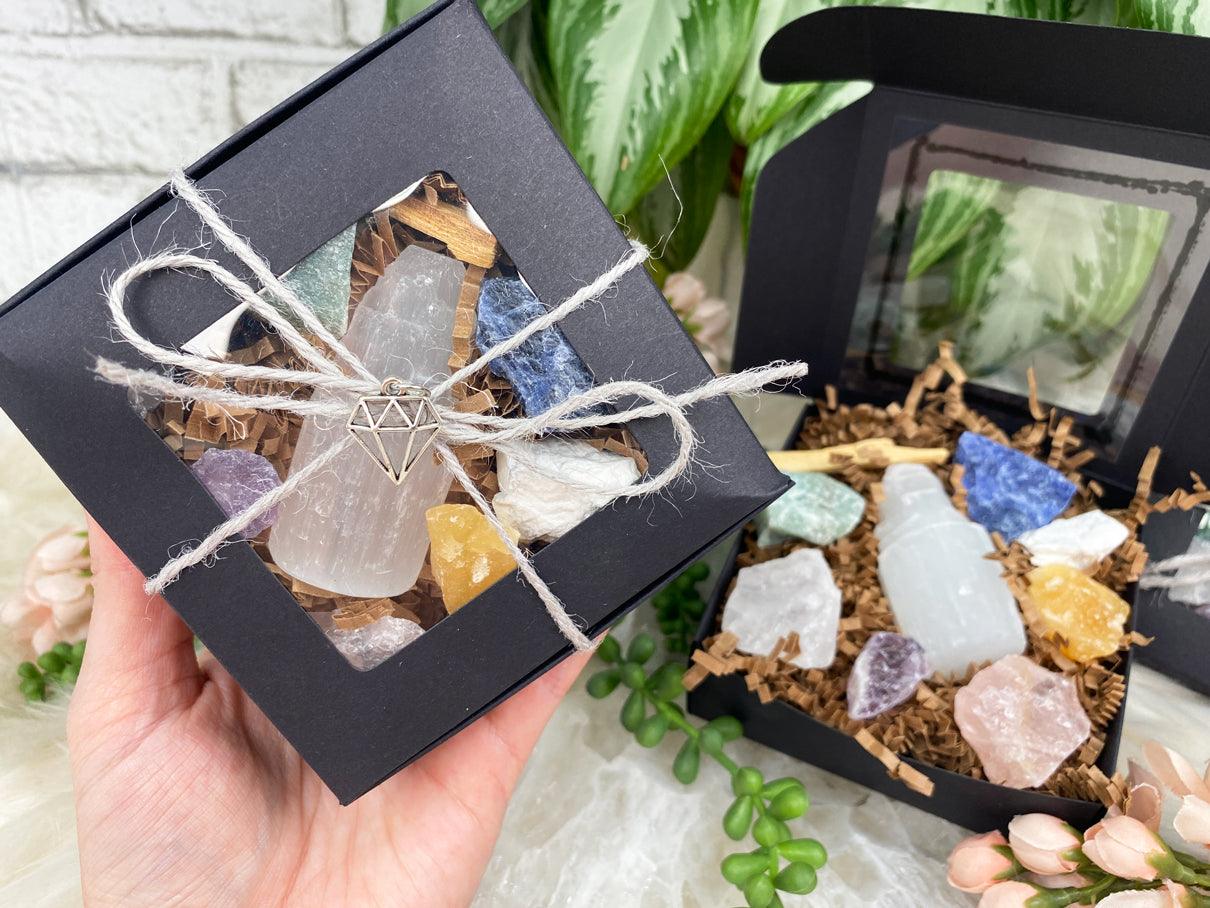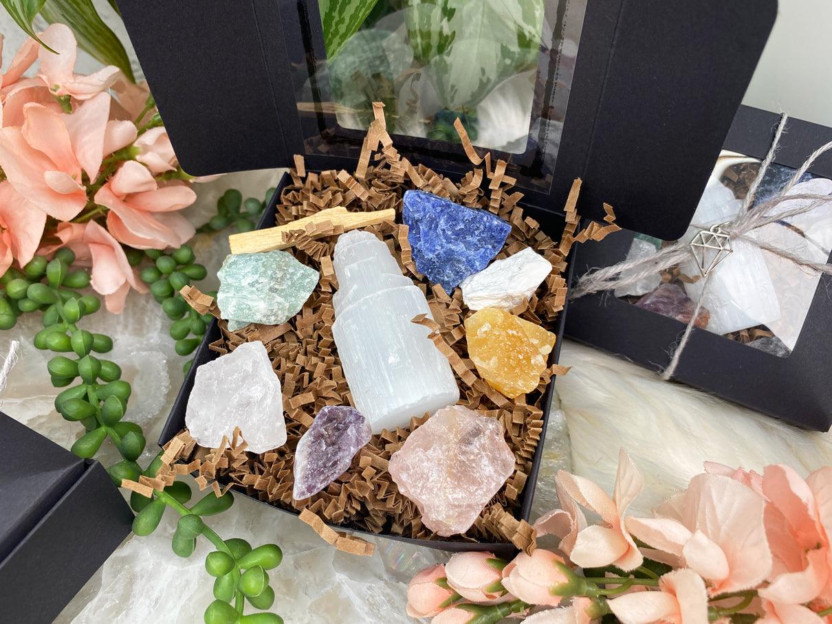 One of our smaller crystal gift sets. Comes with a black gift box and a gray twine bow. The box will come with a little guide on the back if you plan on giving it as a gift for crystal lovers.