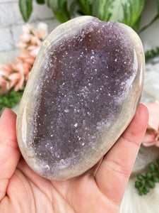 Beautiful Amethyst clusters with a polished edge and back that I lovingly call 'amethyst beans' because a lot of them have that shape. These Amethyst crystals are from Brazil. Each features a cluster face with a polished edge and back, most of the backs are matrix stone, but some have full crystal backs too. The colors vary from light to dark purple, pink hues, yellows, grays and more. They all sparkle beautifully!