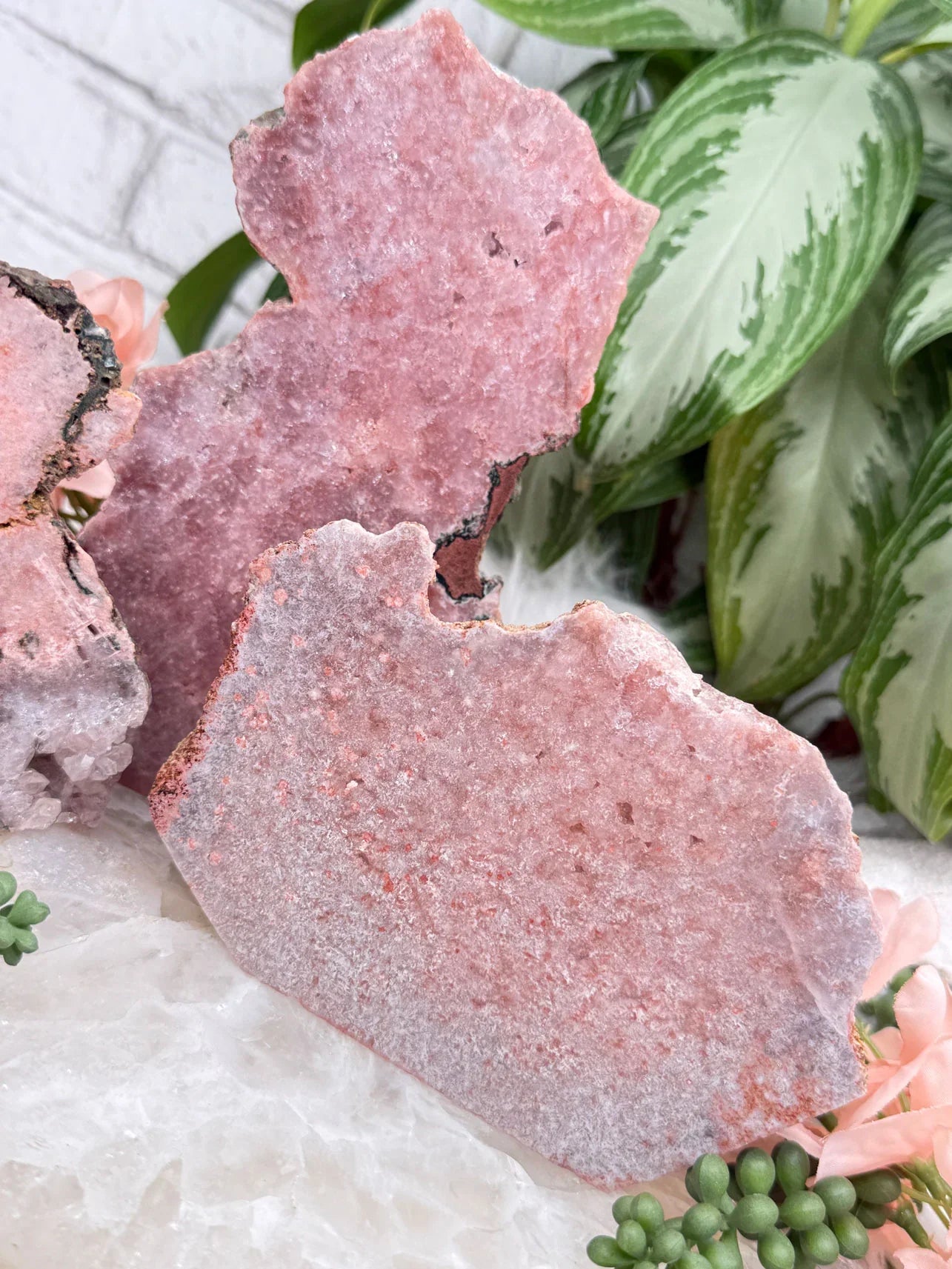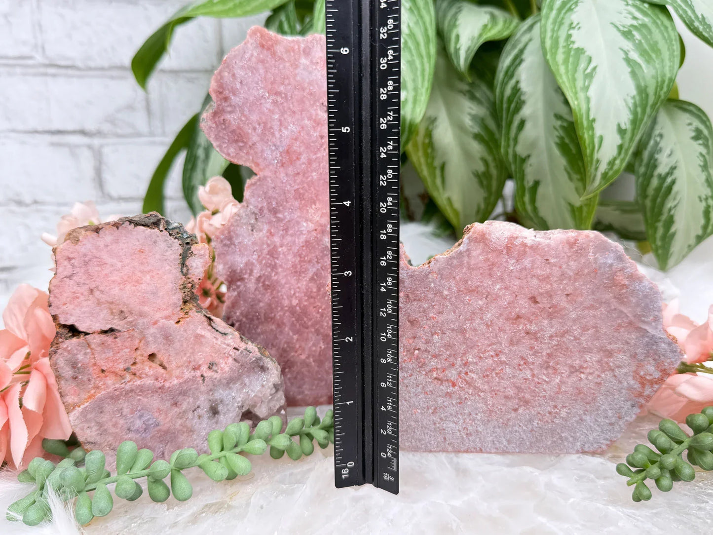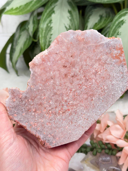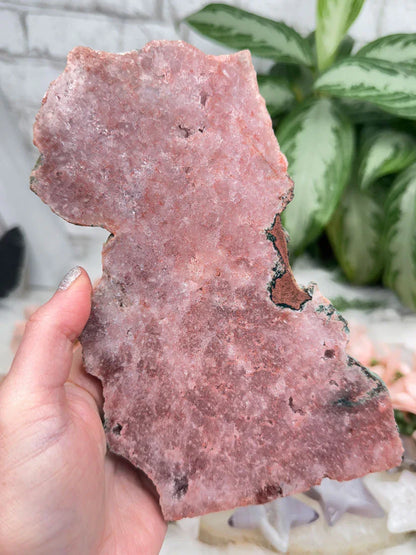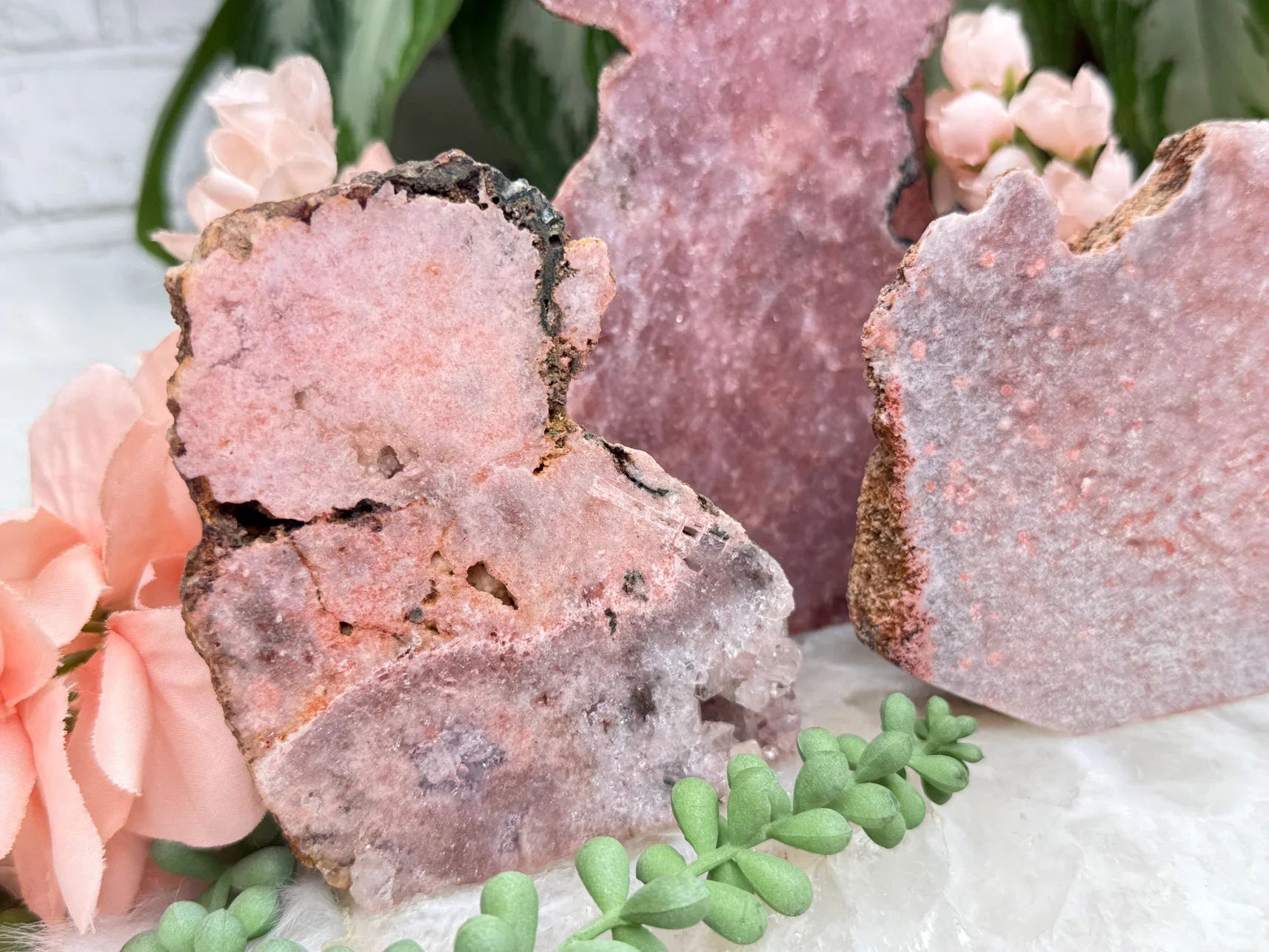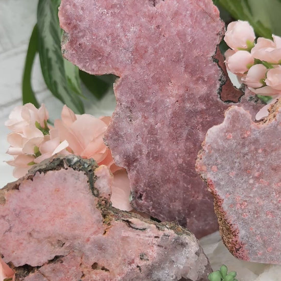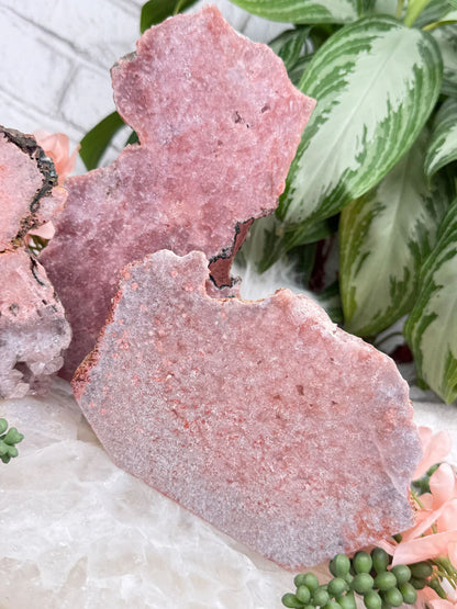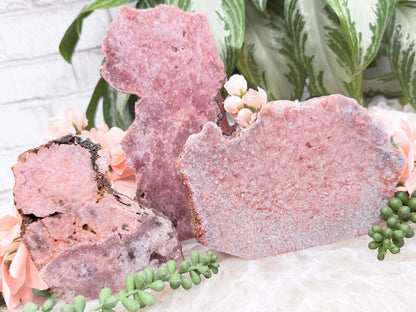 Standing pink amethyst crystals from Brazil. Pink amethyst is a form of amethyst that gets its color from hematite and iron in the crystal. Great pieces for a nightstand, side table, or desk. These pieces are semi-polished so they have a flat front and a raw back.
