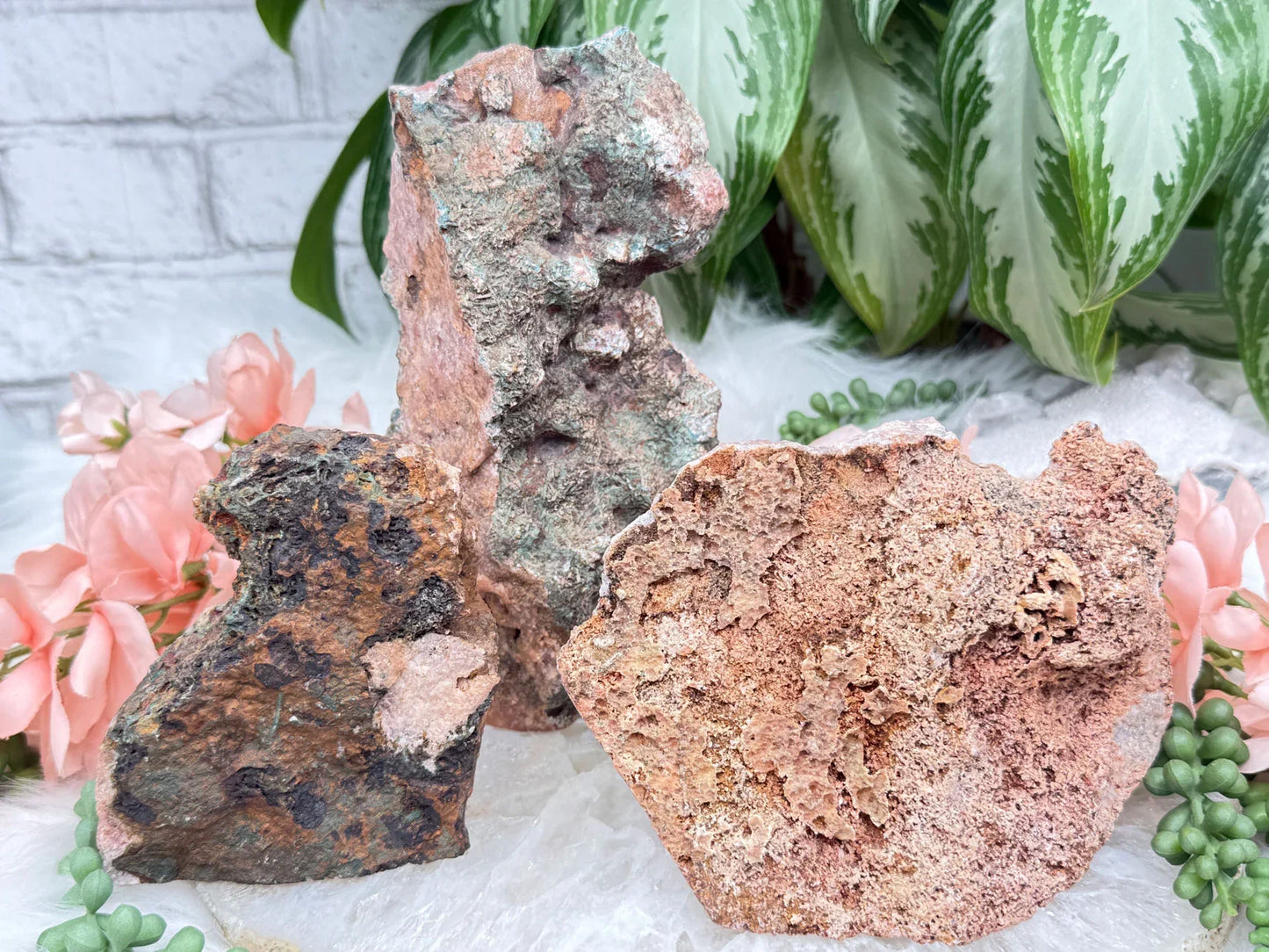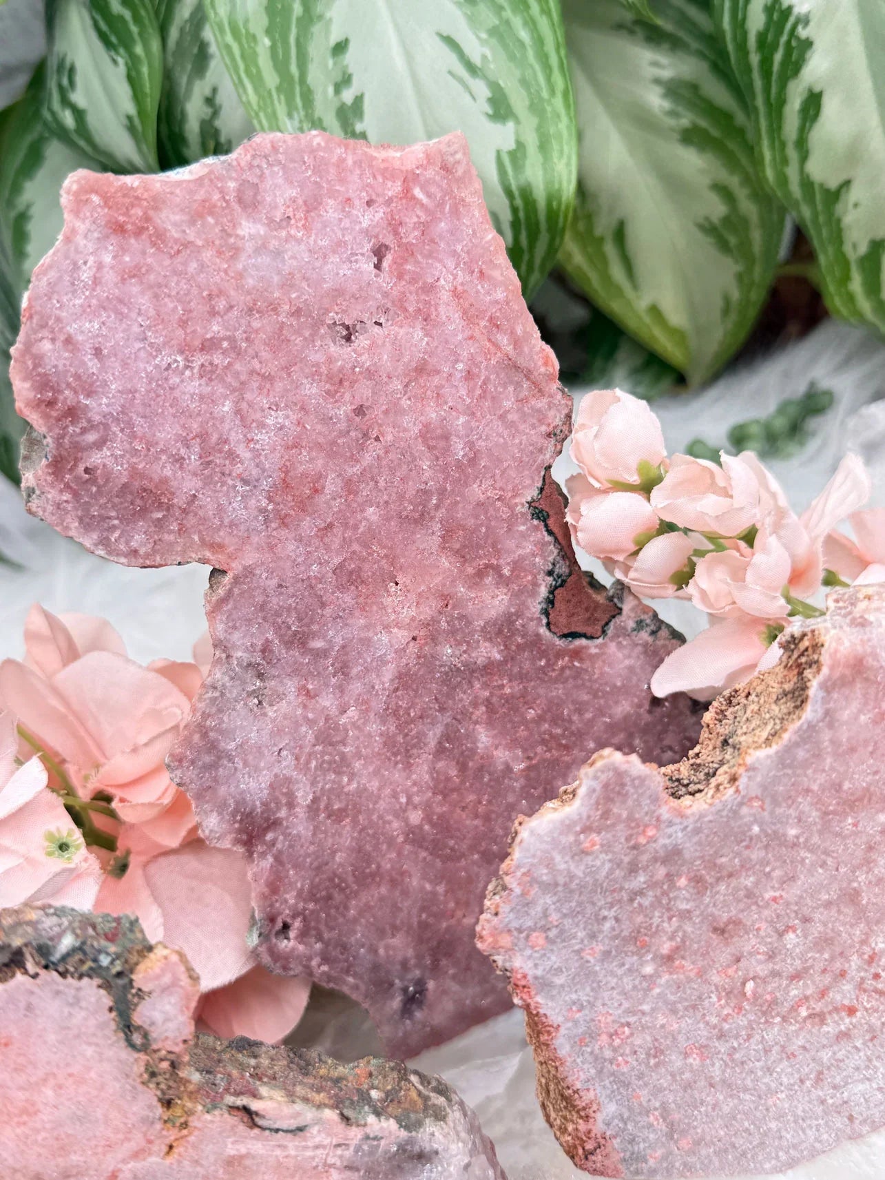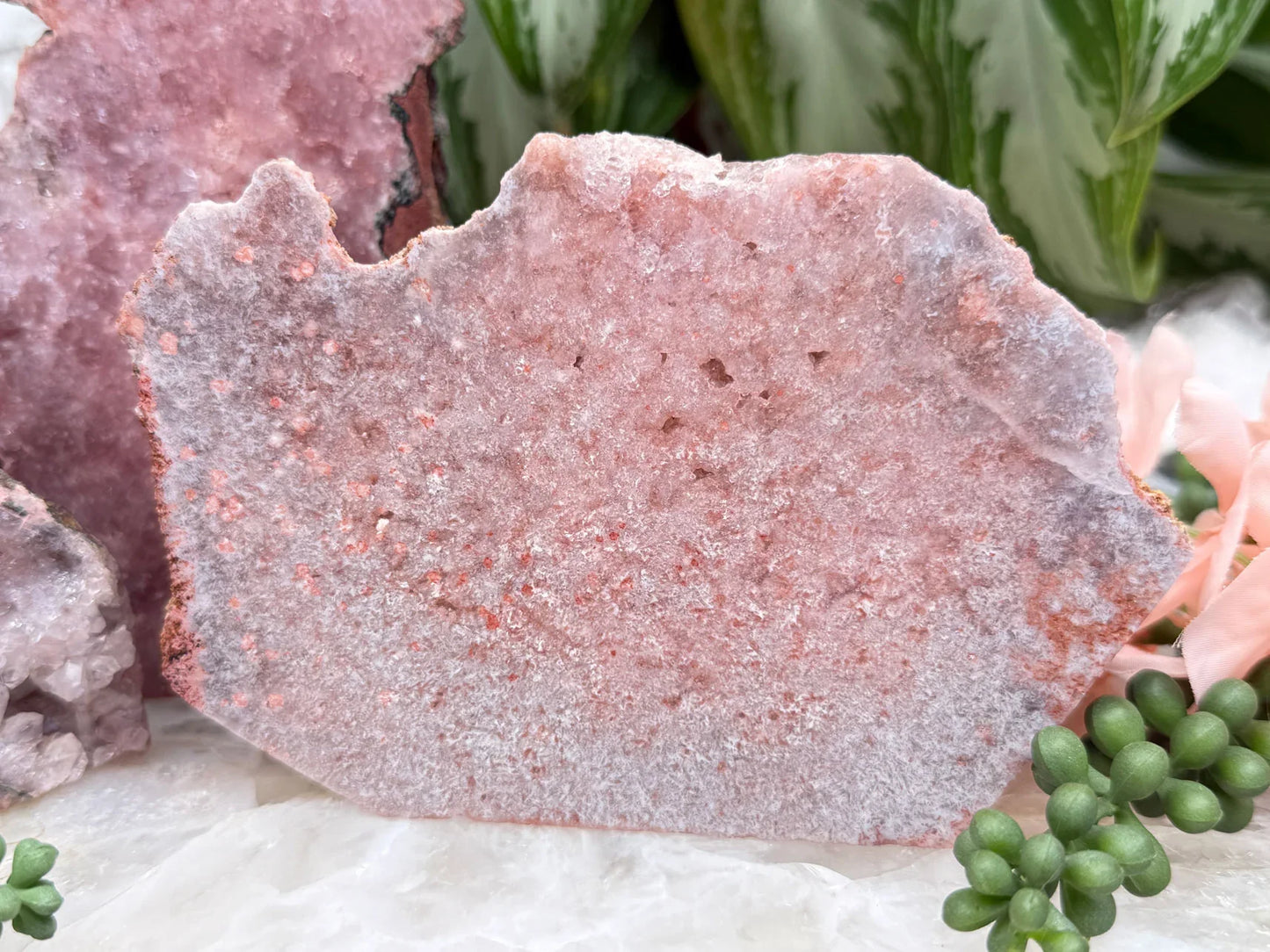 Standing pink amethyst crystals from Brazil. Pink amethyst is a form of amethyst that gets its color from hematite and iron in the crystal. Great pieces for a nightstand, side table, or desk. These pieces are semi-polished so they have a flat front and a raw back.