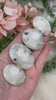 Adorable silver moonstone pebbles or mini palm stone crystals with white and gray coloring! Every piece has a least one flash spot on it! Be sure to take a look at the video for the best look at them. Some of these have dark spots, and some will flash blue while others flash more of a silver. Great for meditation or the smaller palm stones could be kept in a purse or travel with you.