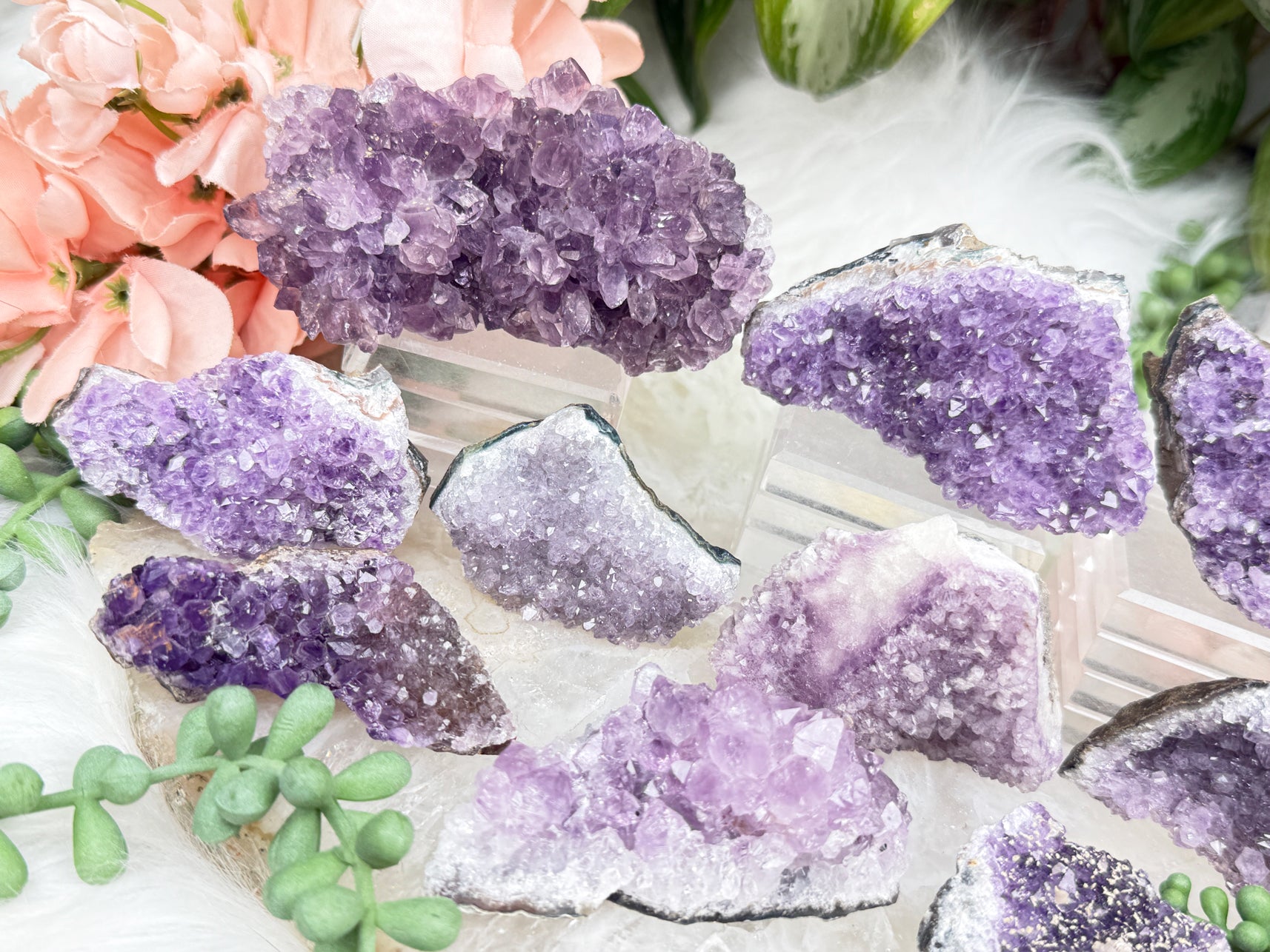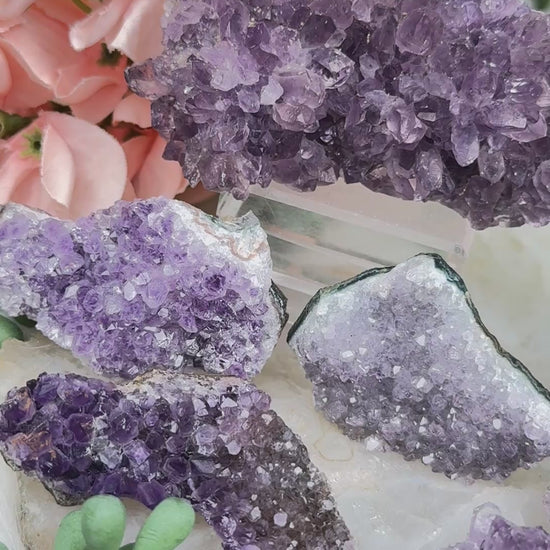 Super cute small amethyst clusters from Brazil. A variety of shades and formations, from light purple almost gray to a deeper and more vibrant purple. Some have a smaller point formation while some are chunkier. Some of these can only lay flat, but some can stand up on their side. One also has a tiny bit of calcite. Please note that these do photograph and video as a brighter purple than they are. They are a very nice saturated purple, just not as bright vibrant as they show on here.