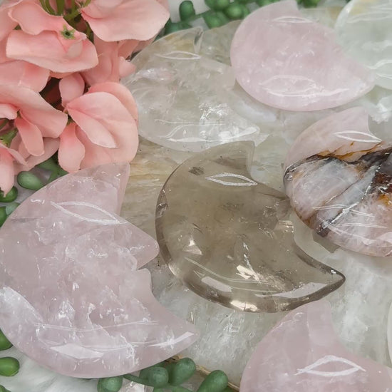 Small quartz family moon carvings from Brazil. Each of these moons have a subtle face carved into them. A mix of quartz, smoky quartz, rose quartz, girasol quarts (back right), and a hematoid rose quartz (3rd row center right). Many have a nice amount of clarity, and a couple even have rainbows! These do not have stands, but I do have a couple larger versions available that do come with a custom stand!