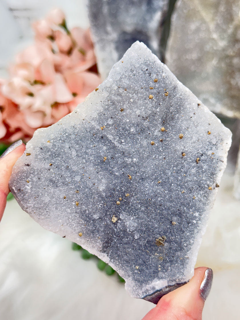 Small light Gray Amethyst crystal clusters from Brazil. These little crystals are a great addition to just about any home decor theme due to their subtle colors. They all have an overall gray coloring and tons and tons of sparkle action! Some of these pieces can all sit a couple different ways, so you can change up the look. They have raw and rough cut sides and backs to them on the matrix stone.
